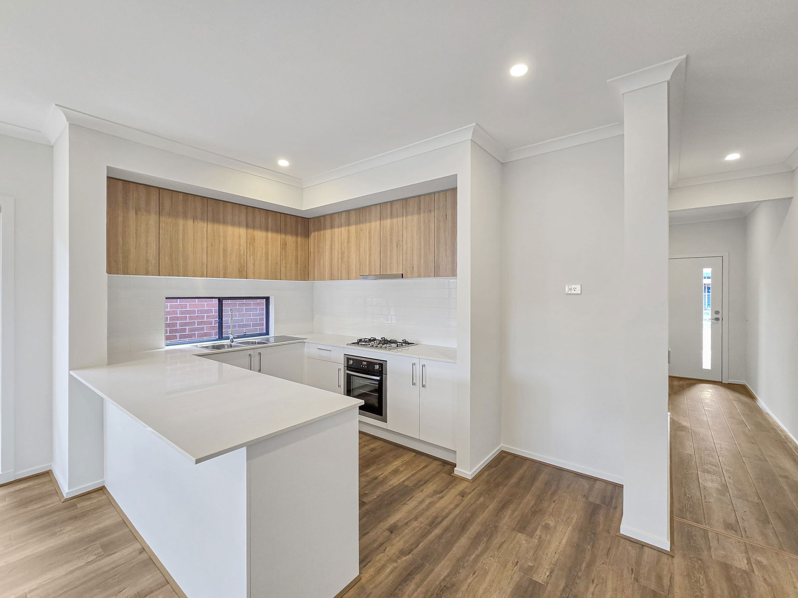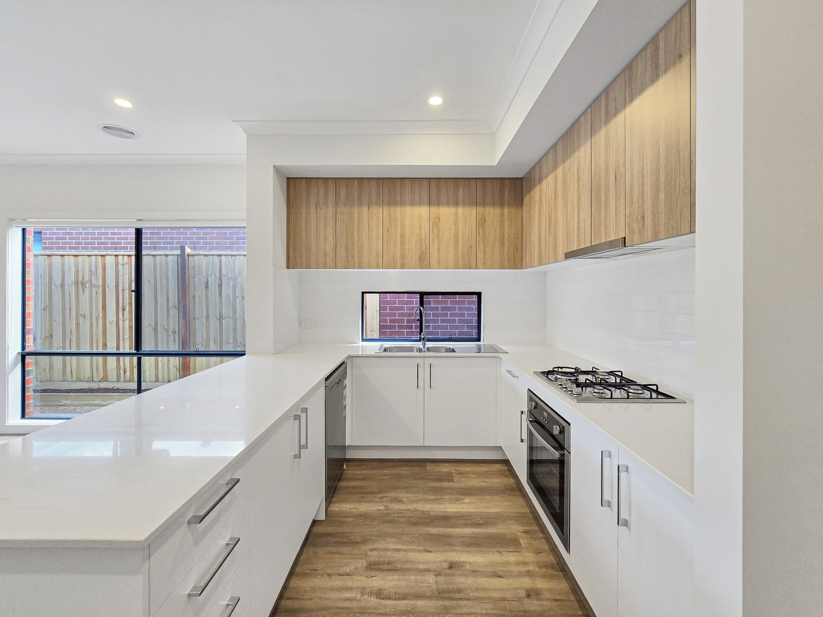 – Kitchen with a window splashback, 4 burner gas cooktop, 600mm electric oven, dishwasher, plenty of cupboards, stone benchtop and a built-in pantry