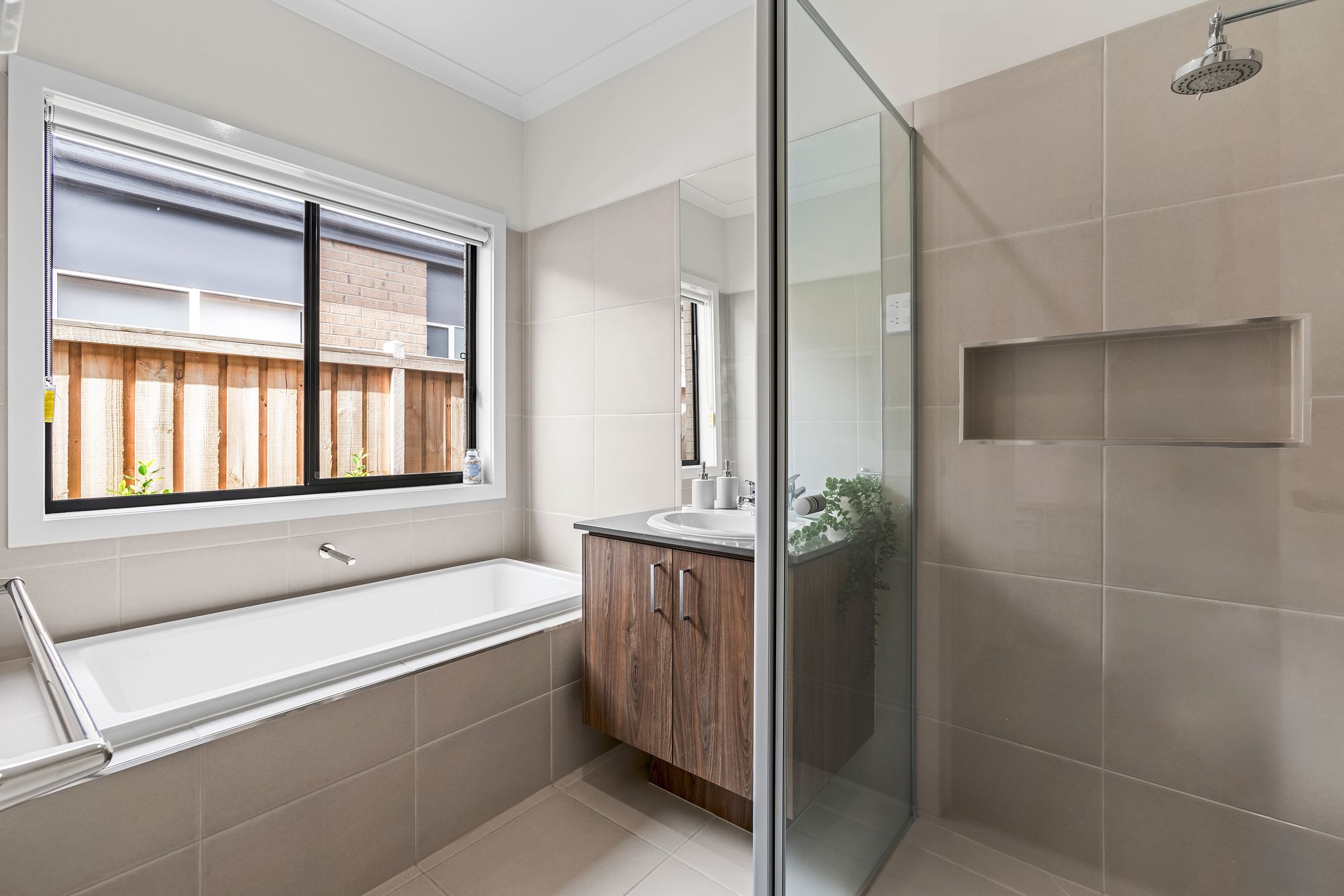 Additional Bathroom: A spacious and modern bathroom featuring a raised bath, a large shower with niche, 20mm stone benchtop vanity, chrome fittings and trims, and a double-glazed window with roller blinds for privacy and natural light.