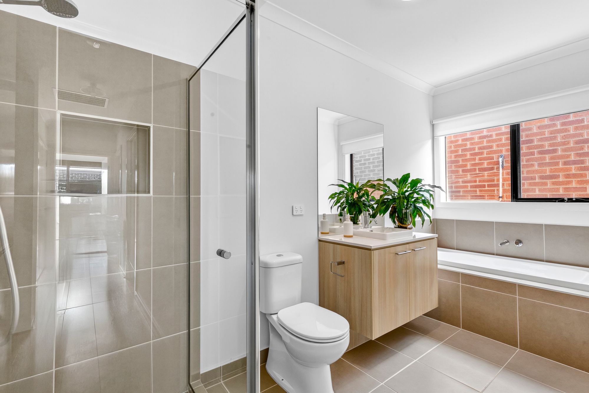 Main Bathroom: Semi frameless shower with niche, bath, basin and vanity with mirror splashback, chrome fittings, roller blinds & toilet.