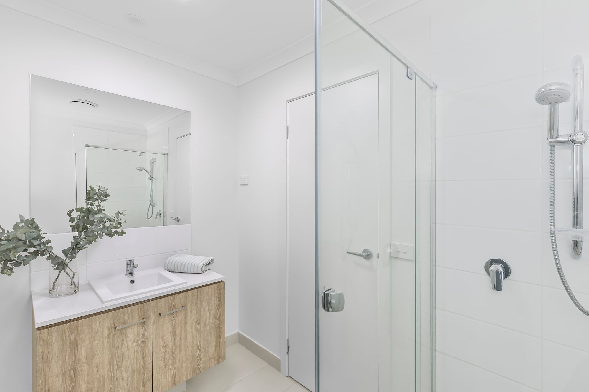 Ensuite: Semi-frameless shower, hand held shower head, 20mm stone benchtop, feature vanity with ample storage, open toilet.