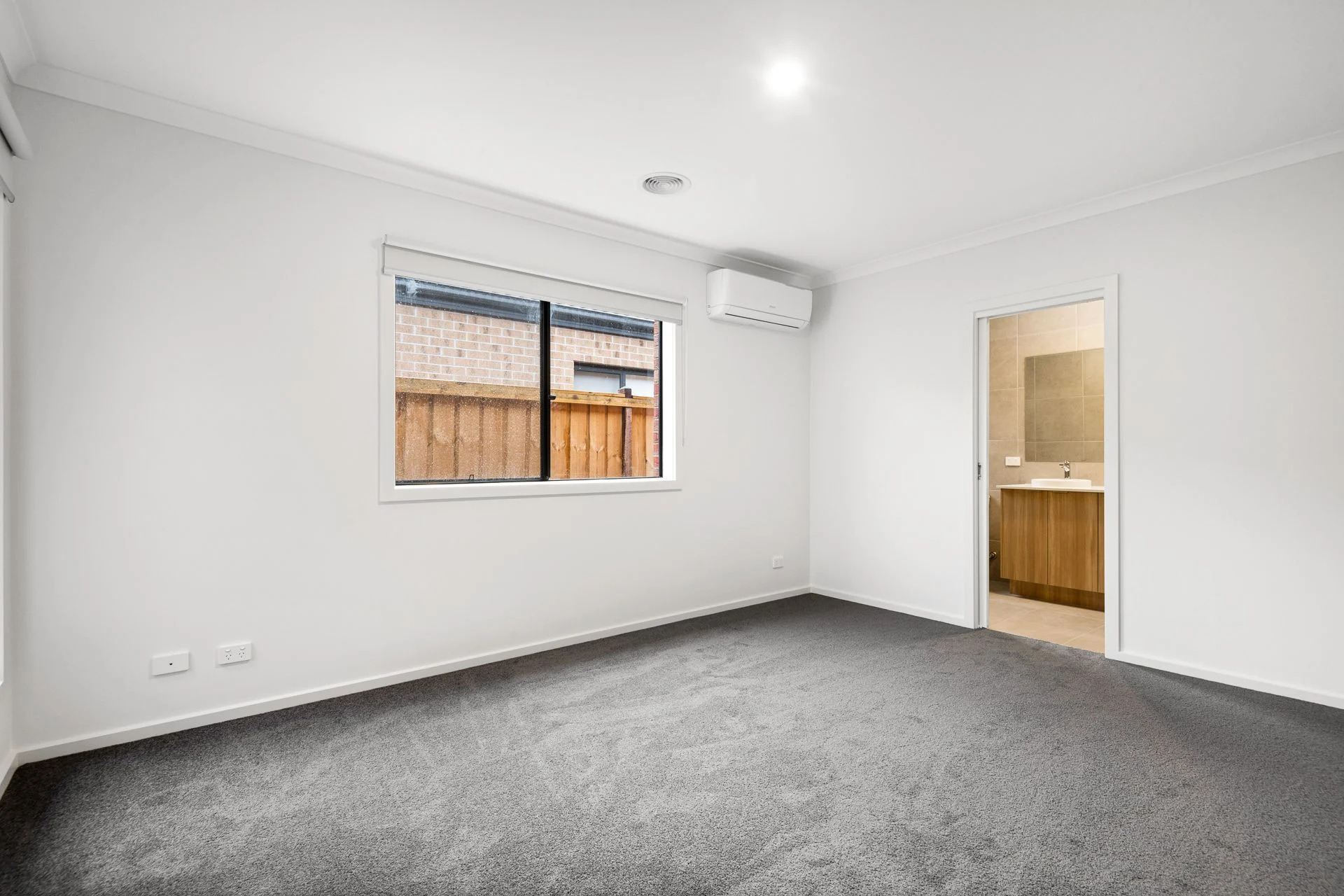 Master Suite: Generous in size, it contains a spacious walk-in robe and ensuite. Accompanied by roller blinds, ducted heating, split system reverse cycle heating & cooling and carpet underfoot, creating a comfortable space year-round. The modern ensuite consists of floor-to-ceiling tiling, an extended double shower with a rainfall shower head and shower niche, double basin & vanity containing stone benchtops and a mirror splashback, and toilet.