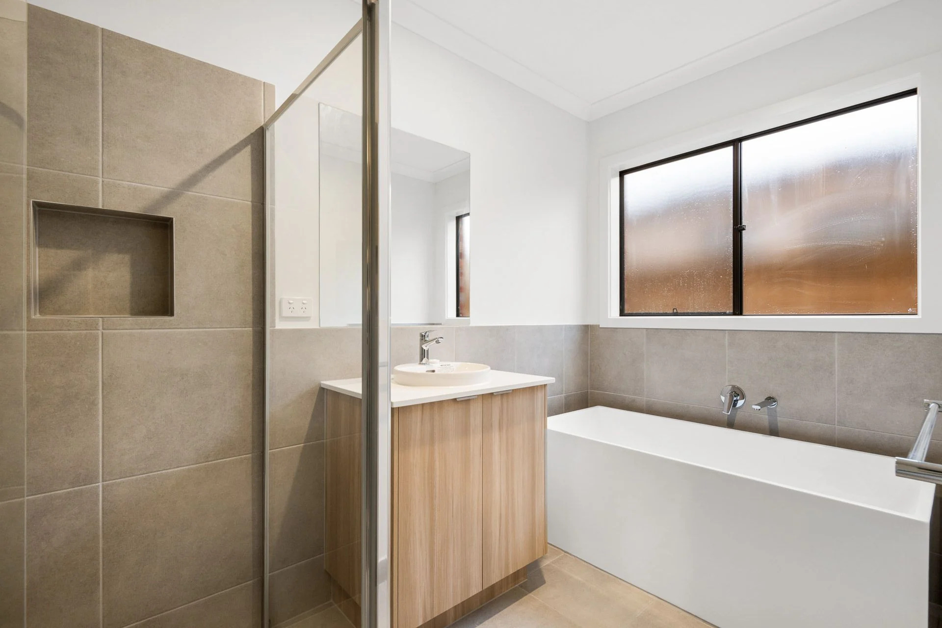 Main Bathroom: Freestanding bathtub, coastal colour palette, semi-frameless shower with niche, basin and vanity with mirrored splashback and stone benchtops.