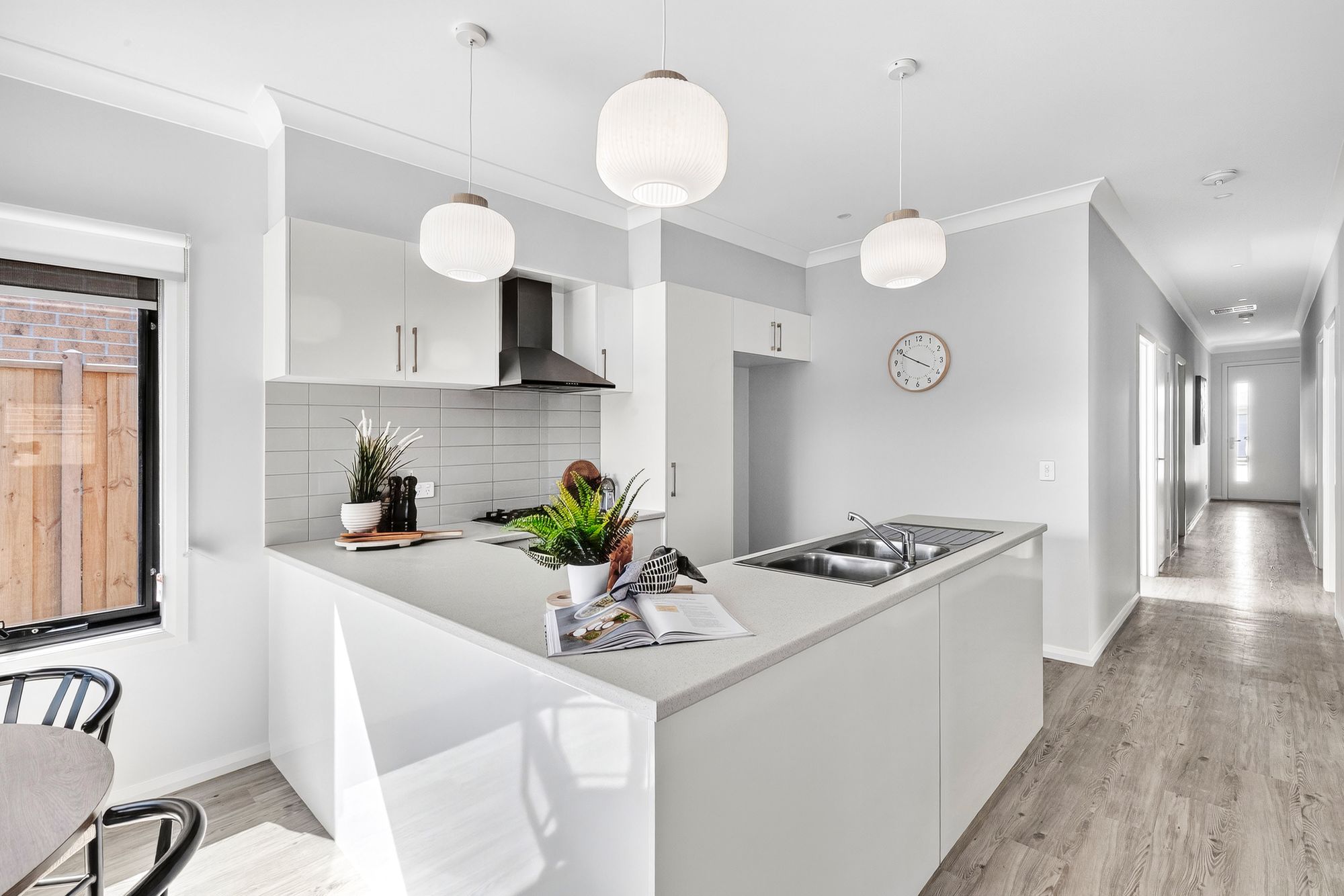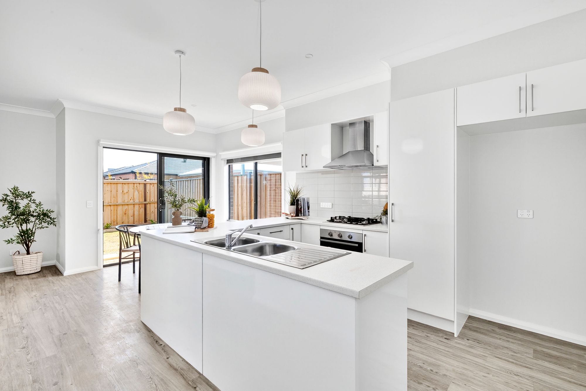 Kitchen: stainless steel gas cooktop, oven & rangehood, built-in pantry, double sink with chrome fittings, overhead cabinetry & additional above-fridge cabinetry, subway tile splashback, dishwasher, downlights & feature pendant lighting.