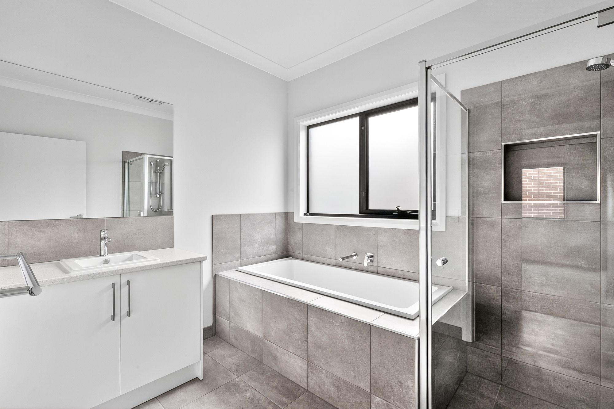 Main bathroom: semi-frameless shower, bathtub, basin and storage vanity with mirror splash back & separate toilet.