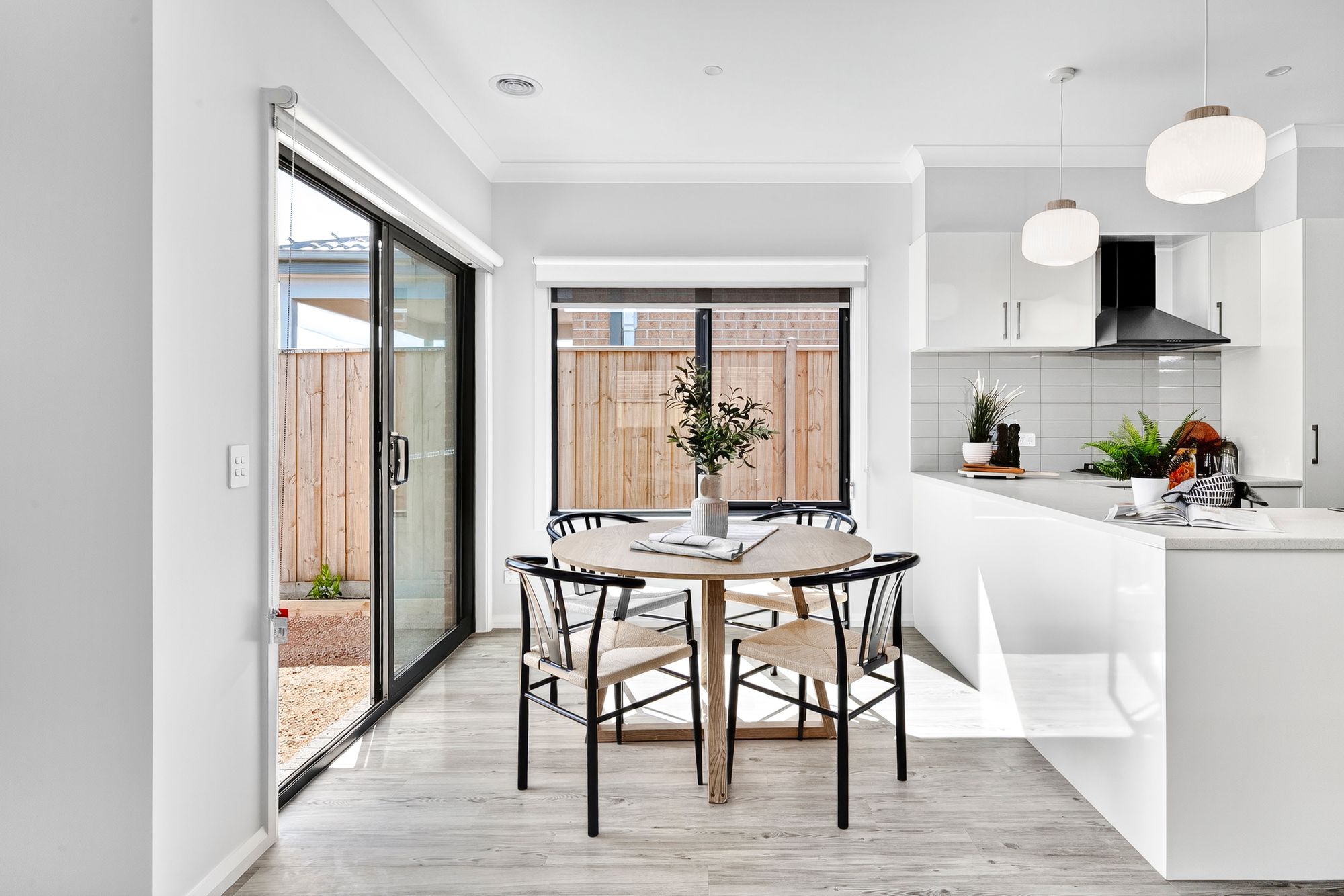 Living area: open plan living & dining, downlights, coastal timber laminate flooring, ducted heating, glass sliding doors to outdoor & dual roller blinds.