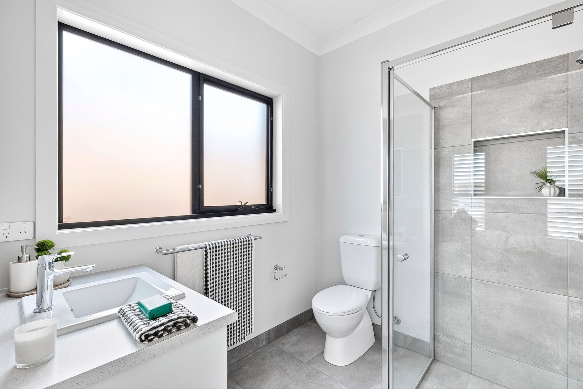 Ensuite: with extended semi-frameless shower & niche, basin and storage vanity, mirror splash back & toilet.