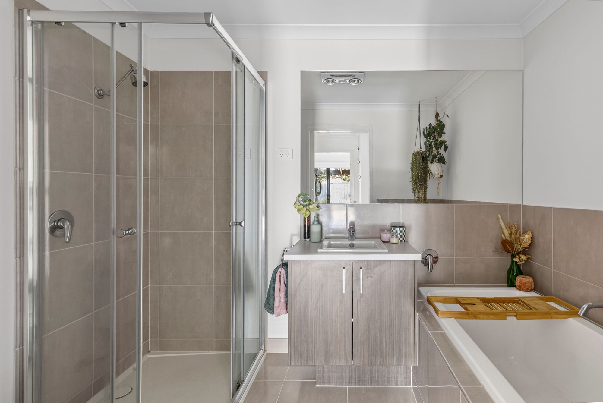 Main bathroom: basin and vanity, large mirror splash back, extended semi frameless shower, bath, toilet.