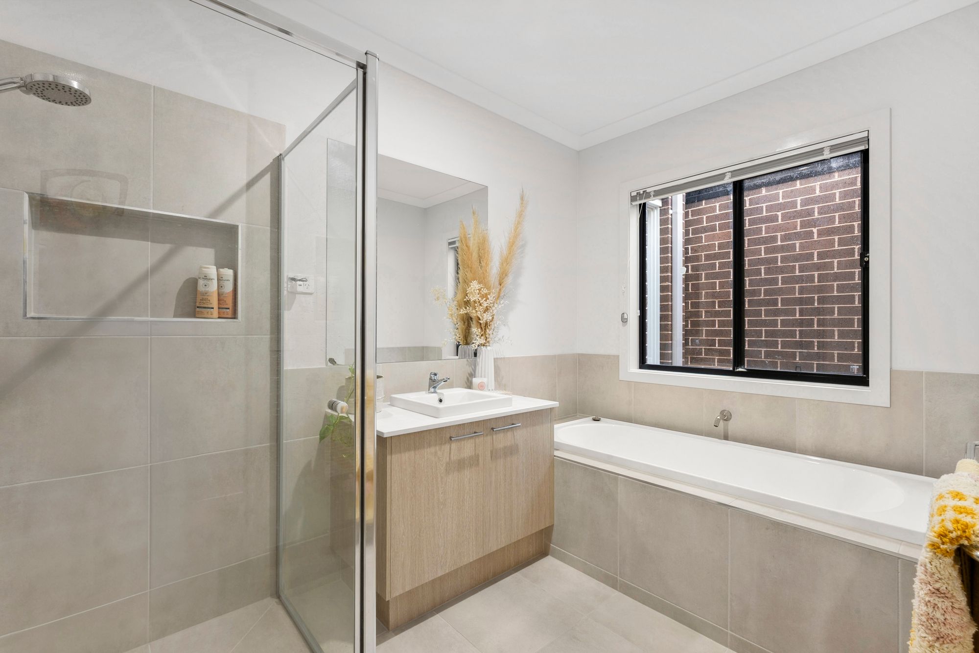 The main bathroom is both stylish and functional. It features a shower with a 20mm stone benchtop vanity, a large mirror, a shower niche, a toilet, and a tiled bath—perfect for relaxation.
