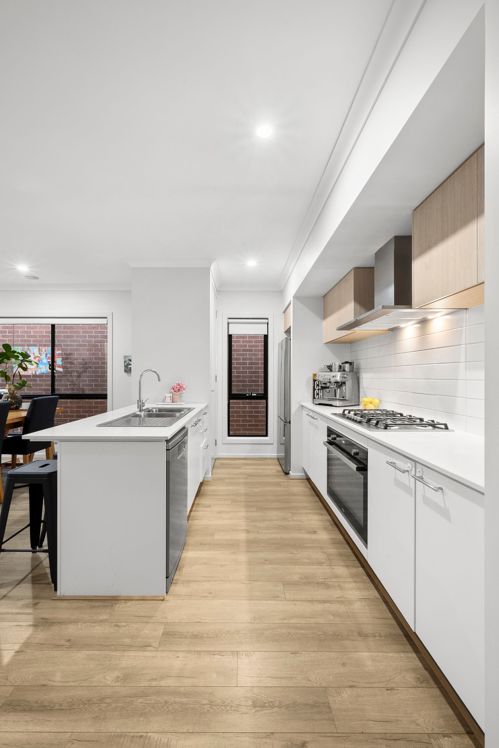 Step into the heart of the home with an open-plan kitchen that boasts built-in cabinetry, a walk-in pantry for ample storage, and a spacious fridge cavity. The kitchen has a 20mm stone benchtop, including a convenient breakfast bar overhang. High-end appliances are at your fingertips, including a 900mm gas cooktop, an electric oven, and a dual overmount stainless steel sink. This space is practical and stylish with gas ducted heating, downlights, and a feature tiled splashback. Additionally, there is a microwave cavity, dishwasher, and roller blinds for added convenience.