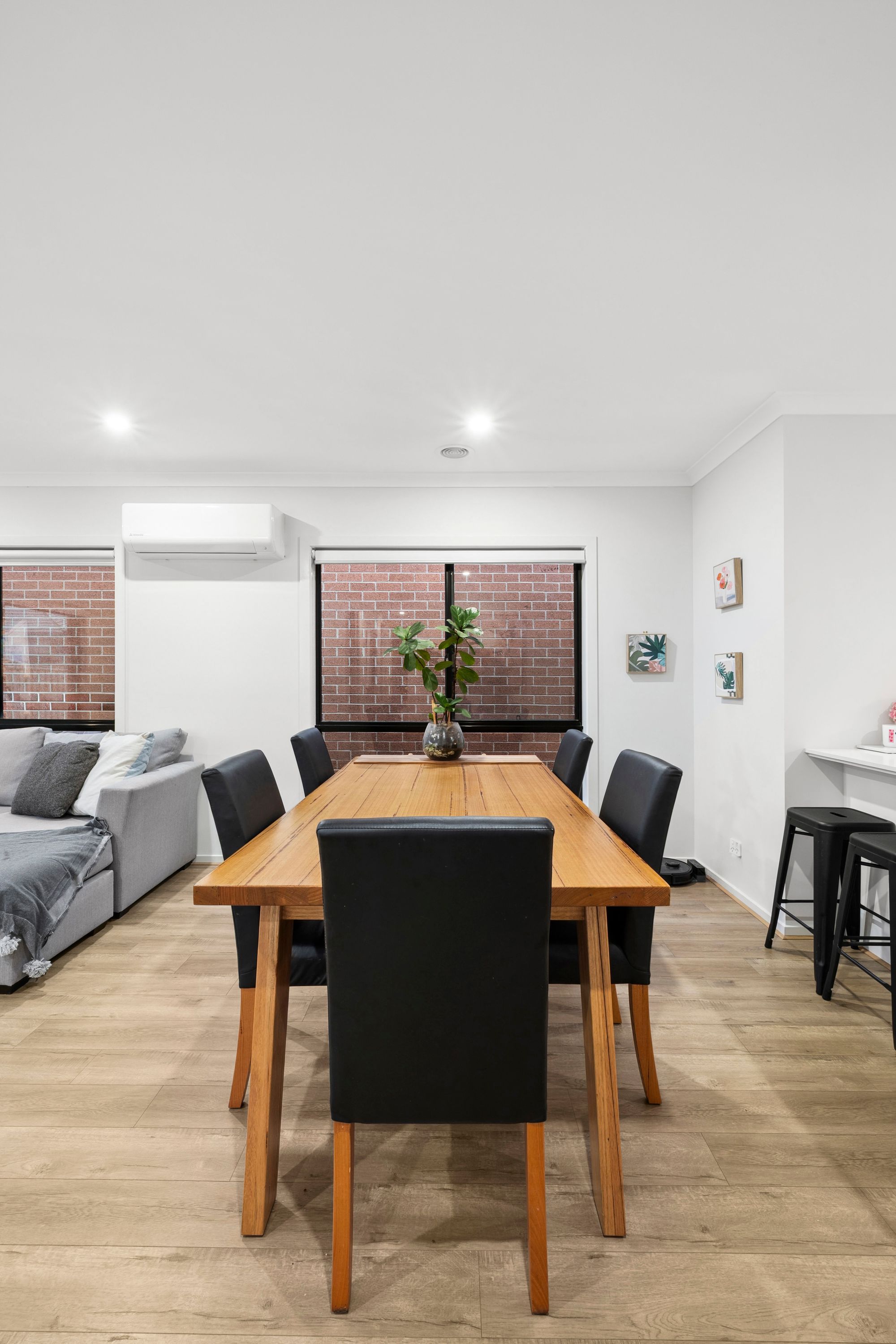 This open-plan living, dining, and kitchen area is perfect for family gatherings or entertaining guests. The timber laminate flooring adds warmth, while the split system heating and cooling, ducted heating, and downlights provide year-round comfort. Large sliding glass doors open to the backyard, extending your living space outdoors.