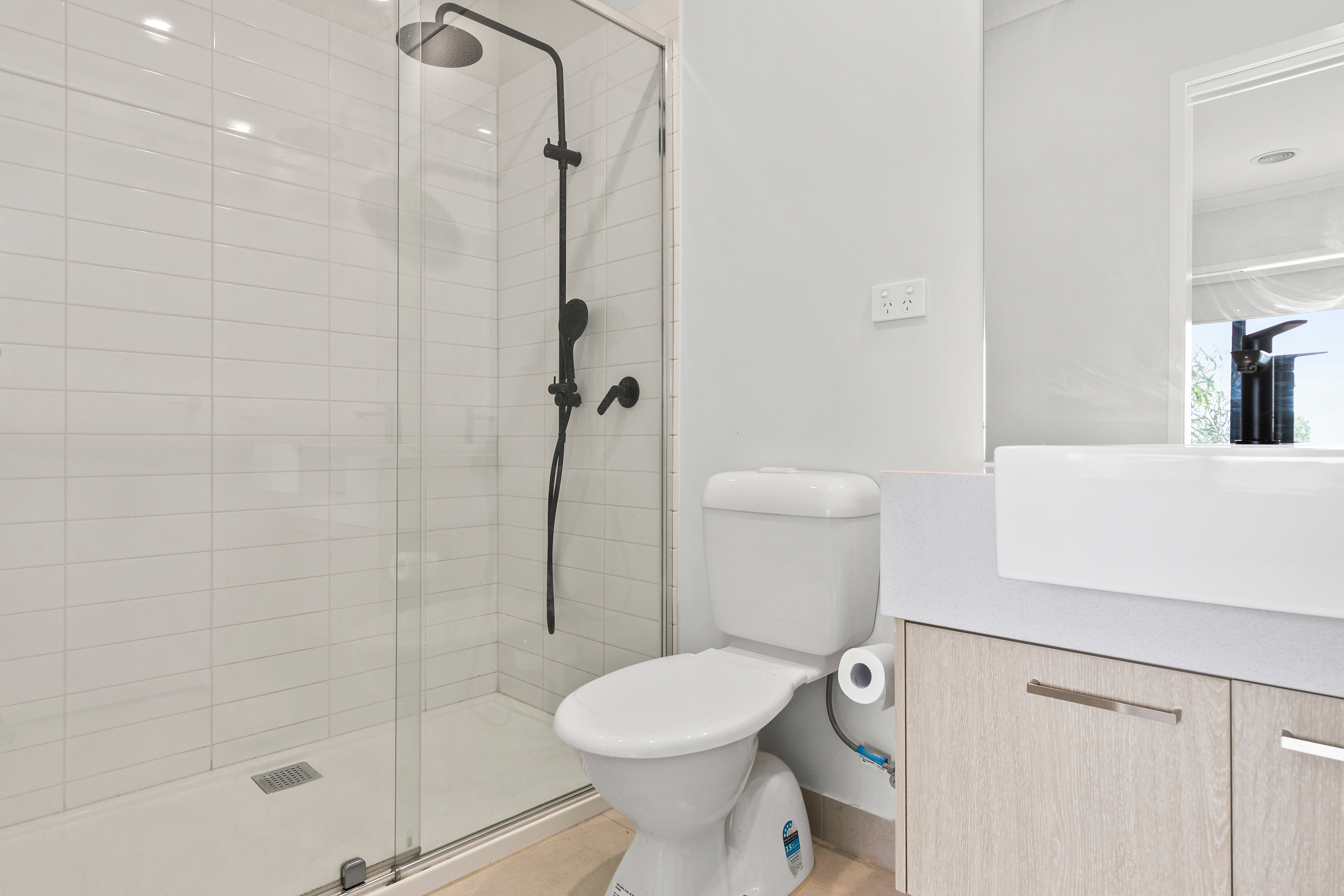 Ensuite: Semi-frameless shower, hand held shower head, single vanity with ample storage, open toilet, tiles.