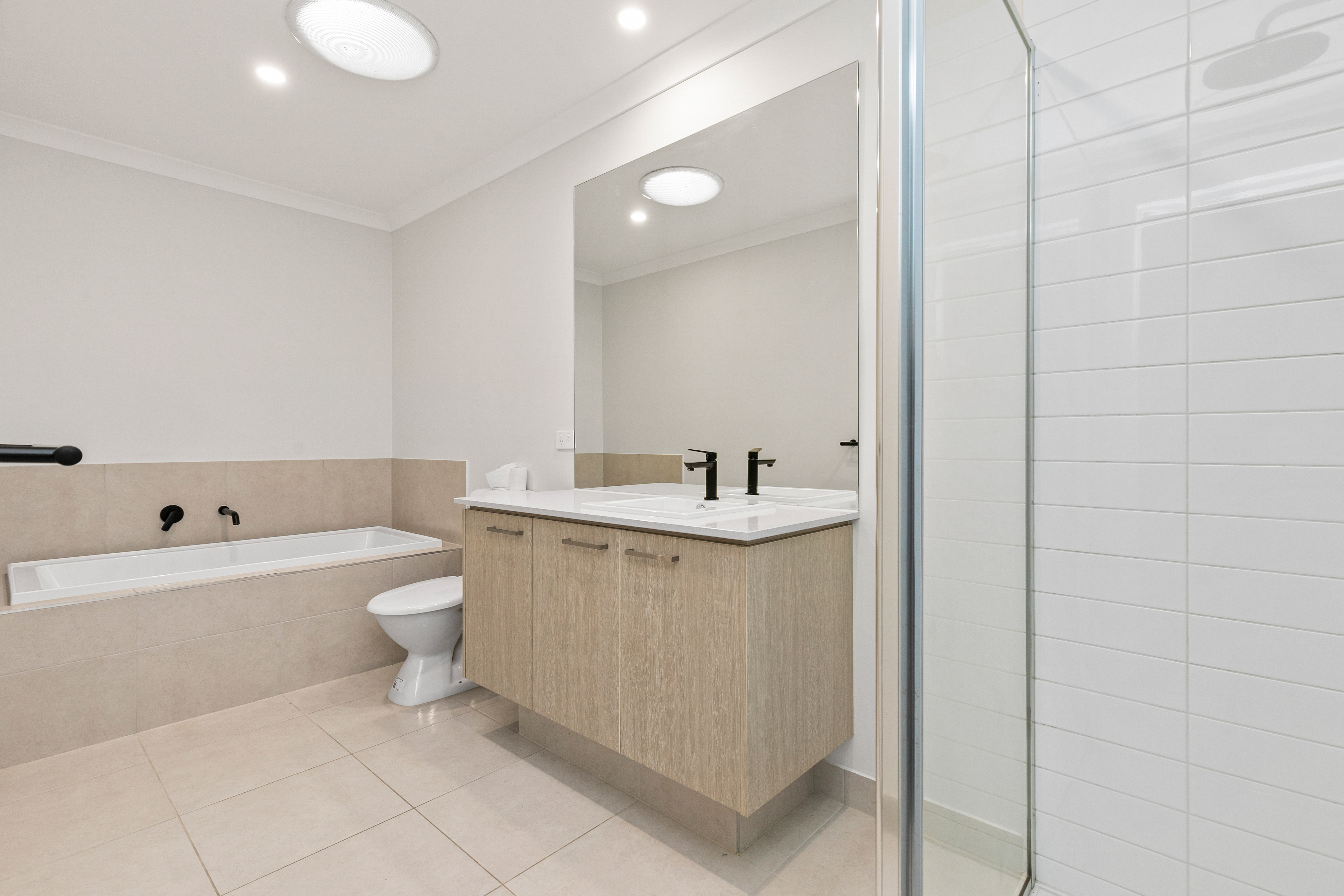 Main Bathroom: Spacious, bath, semi-frameless shower, rainfall shower head, black tapware, large single vanity with ample storage, open toilet, downlights, window.