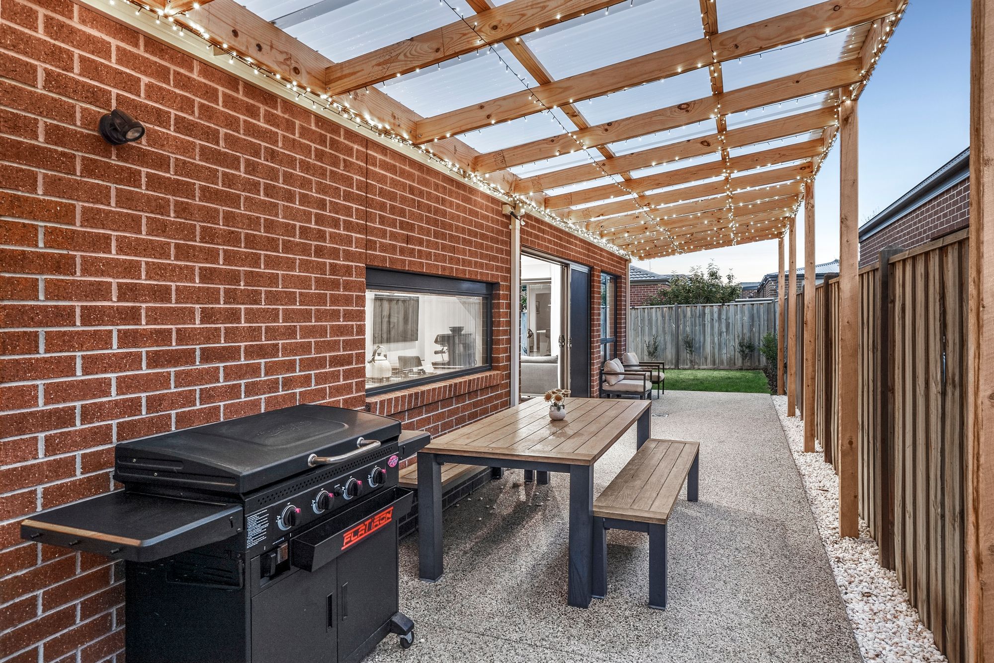 Outdoor: Expansive undercover outdoor entertaining area, exposed aggregate concrete under alfresco, established grass and garden beds, clothesline, single side gate access.