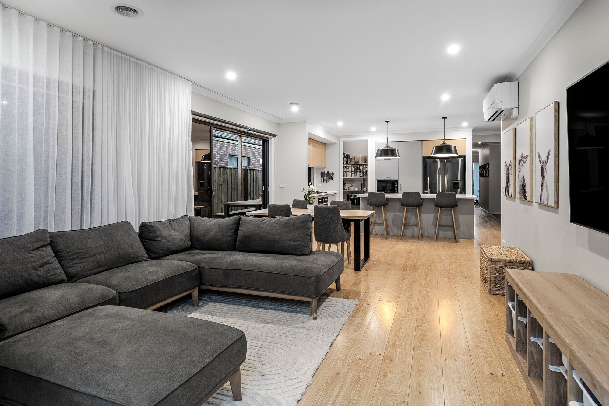 Living / Dining: Open plan, upgraded floorboards, downlights, reverse cycle split system, ducted heating, sheer curtains, roller blinds, high ceilings, dual glass stacking doors with security screen, TV and antenna points, multiple powerpoints