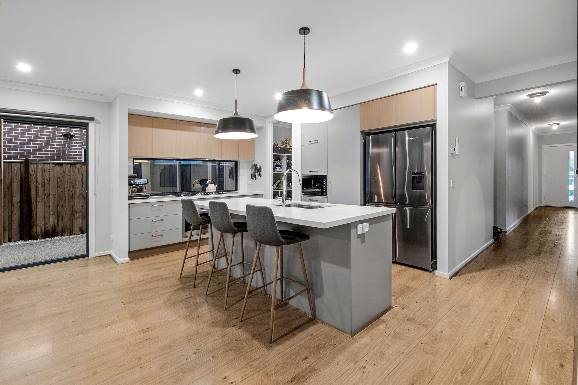 Kitchen: Expansive kitchen, 40mm stone island bench with breakfast bar overhang, 900mm gas cooktop. 900mm electric oven, dual under mount sink, dishwasher, large window splash back, generous fridge cavity, integrated microwave, downlights, under-mount range hood, feature pendant lights, generous walk-in pantry with plenty of storage,