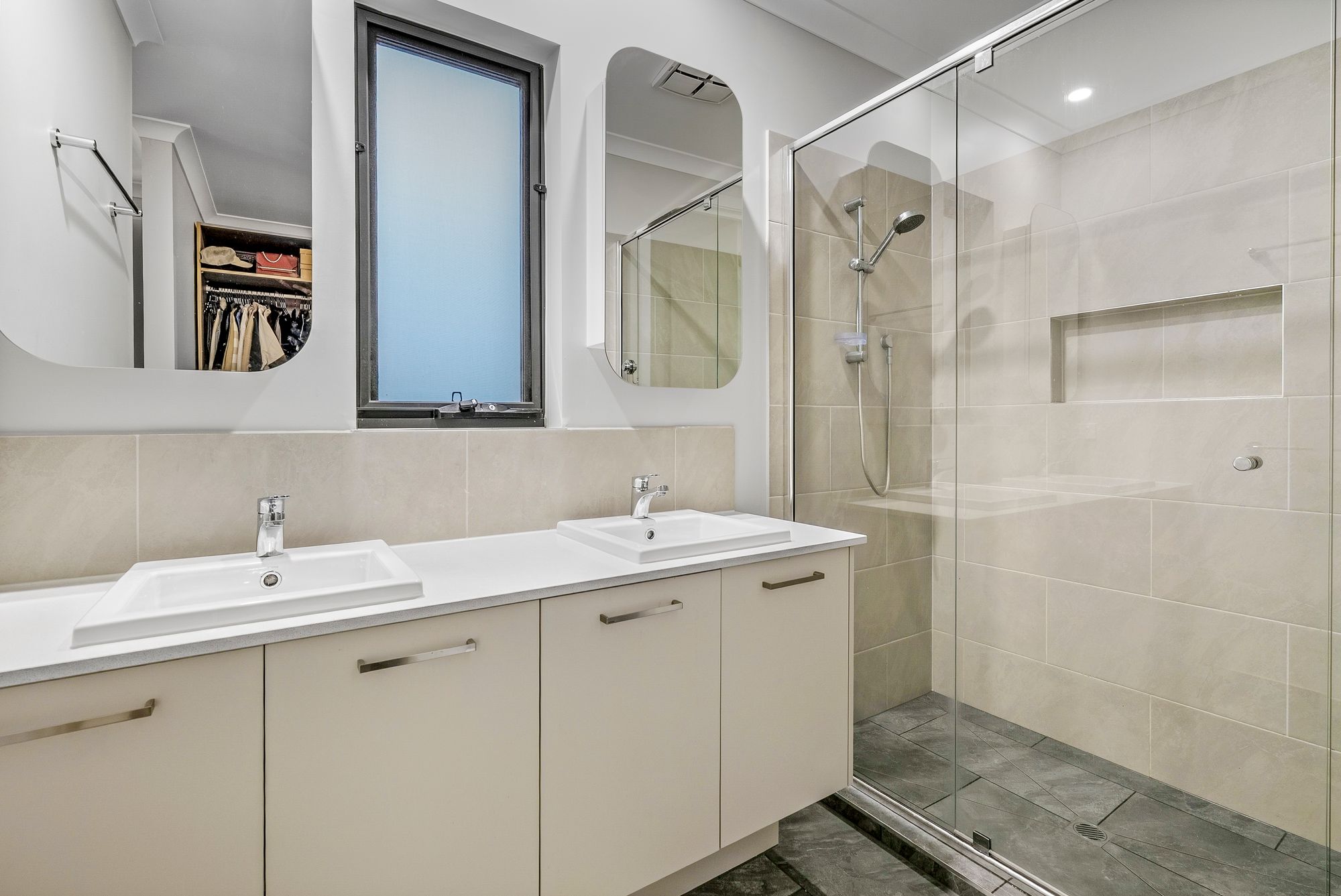 Master Bedroom: Large master suite, ceiling fan with light, sheer curtains, roller blinds, ducted heating, upgraded carpets, multiple power points, large walk-in wardrobe with custom joinery. Ensuite; Tiled, dual vanity & basins, 20mm stone benchtop, dual mirrors, double semi-frameless shower with handheld shower head, large niche, personal toilet, chrome fittings, double towel rail, ample storage, high ceiling, exhaust fan