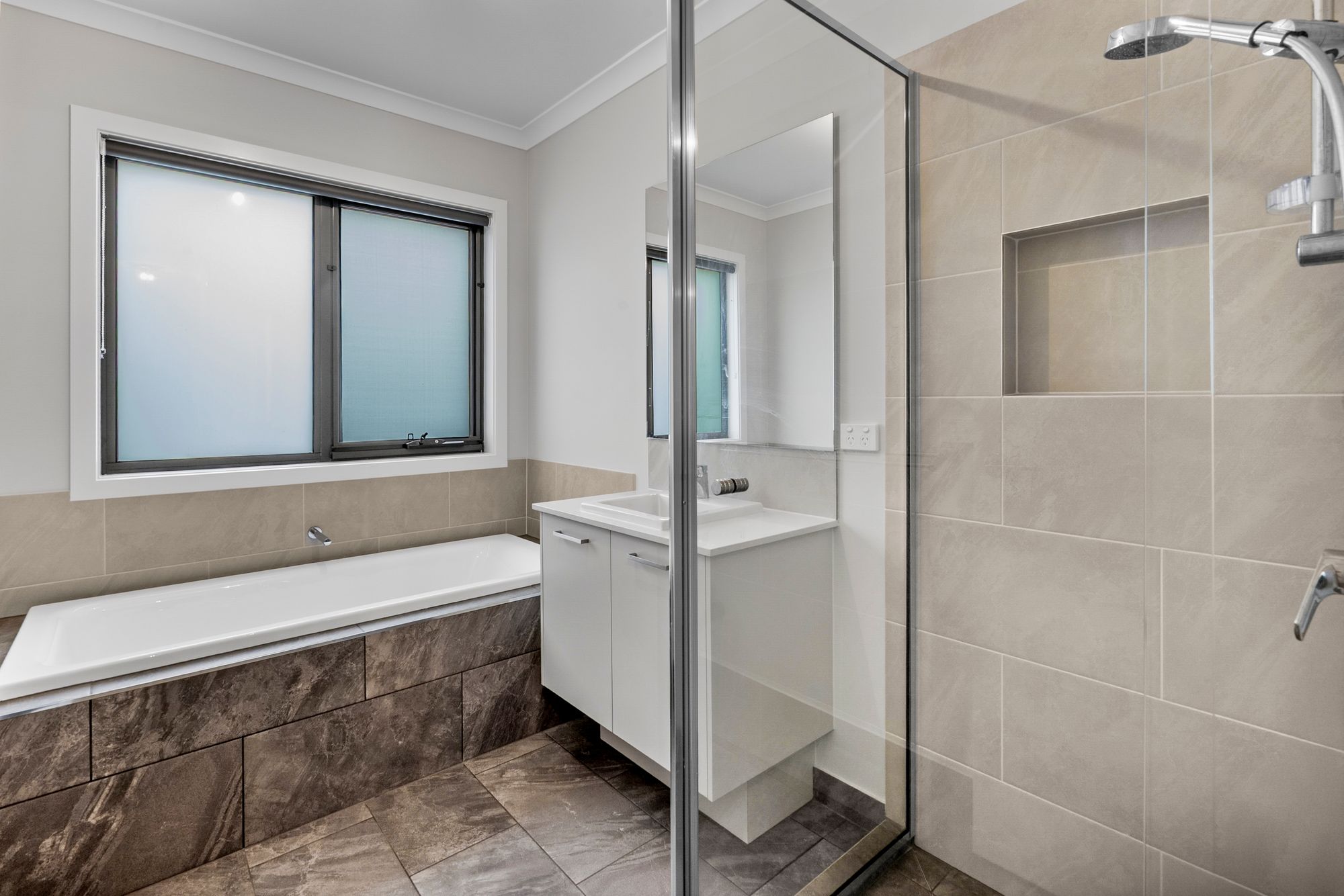 Main Bathroom: Tiled, 20mm stone benchtop, single vanity with basin and oversized mirror splashback, roller blind, semi-frameless shower with handheld shower head, shower niche, tiled in bath, ceiling light, multiple power points, private toilet.