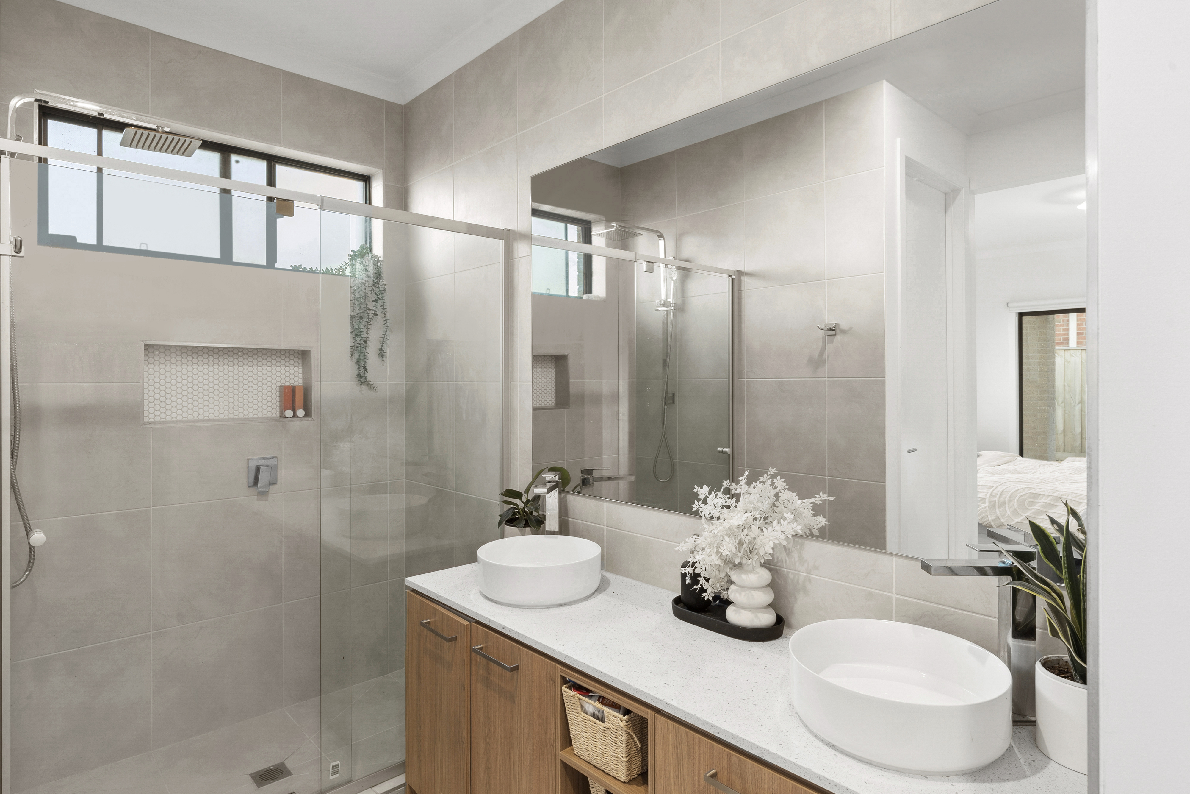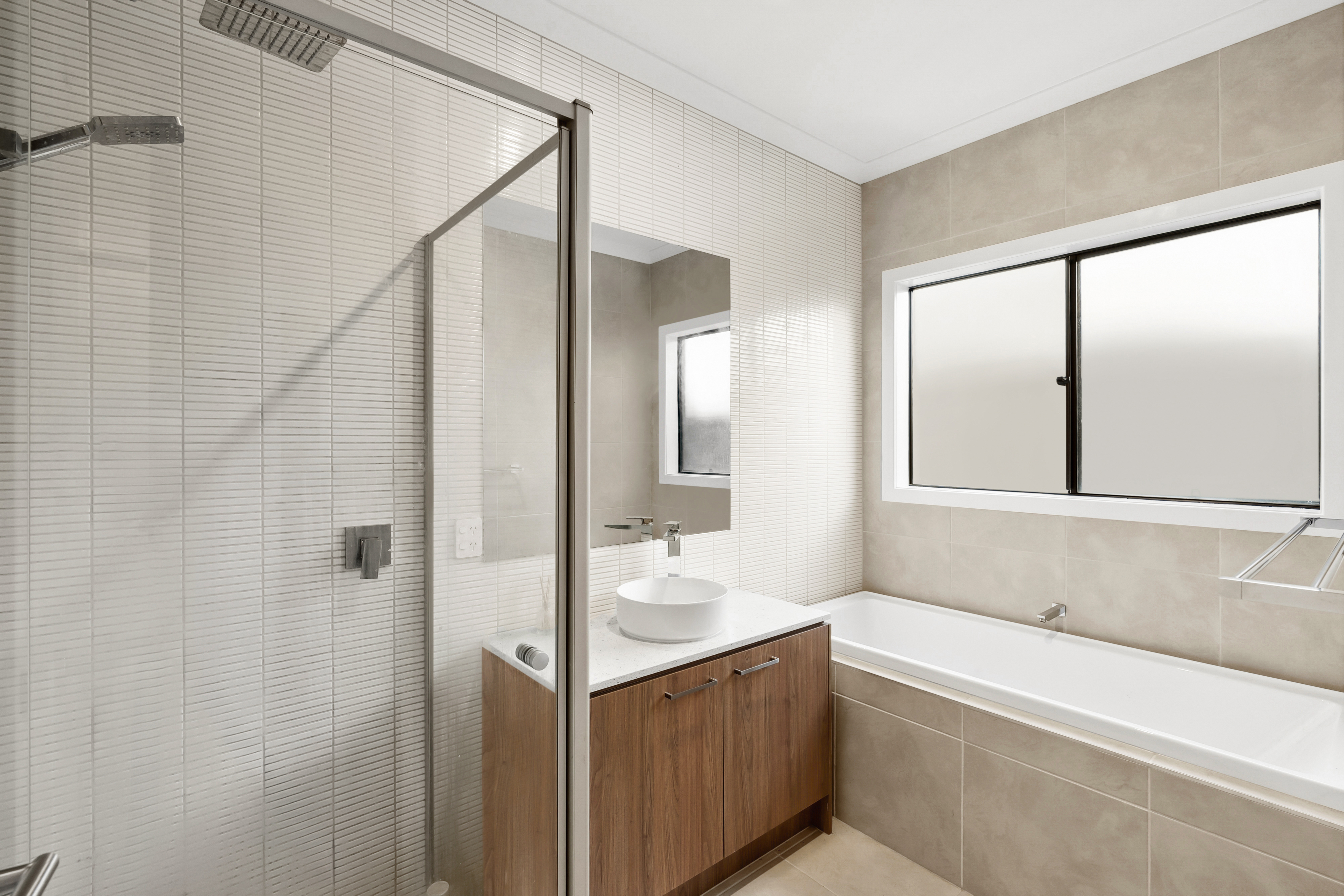 Main bathroom: Bathtub, premium floor-to-ceiling tiling, semi frameless shower with stylish niche, double shower head (rainfall and handheld), basin and vanity with mirror splashback, frosted window, chrome fittings & separate toilet.