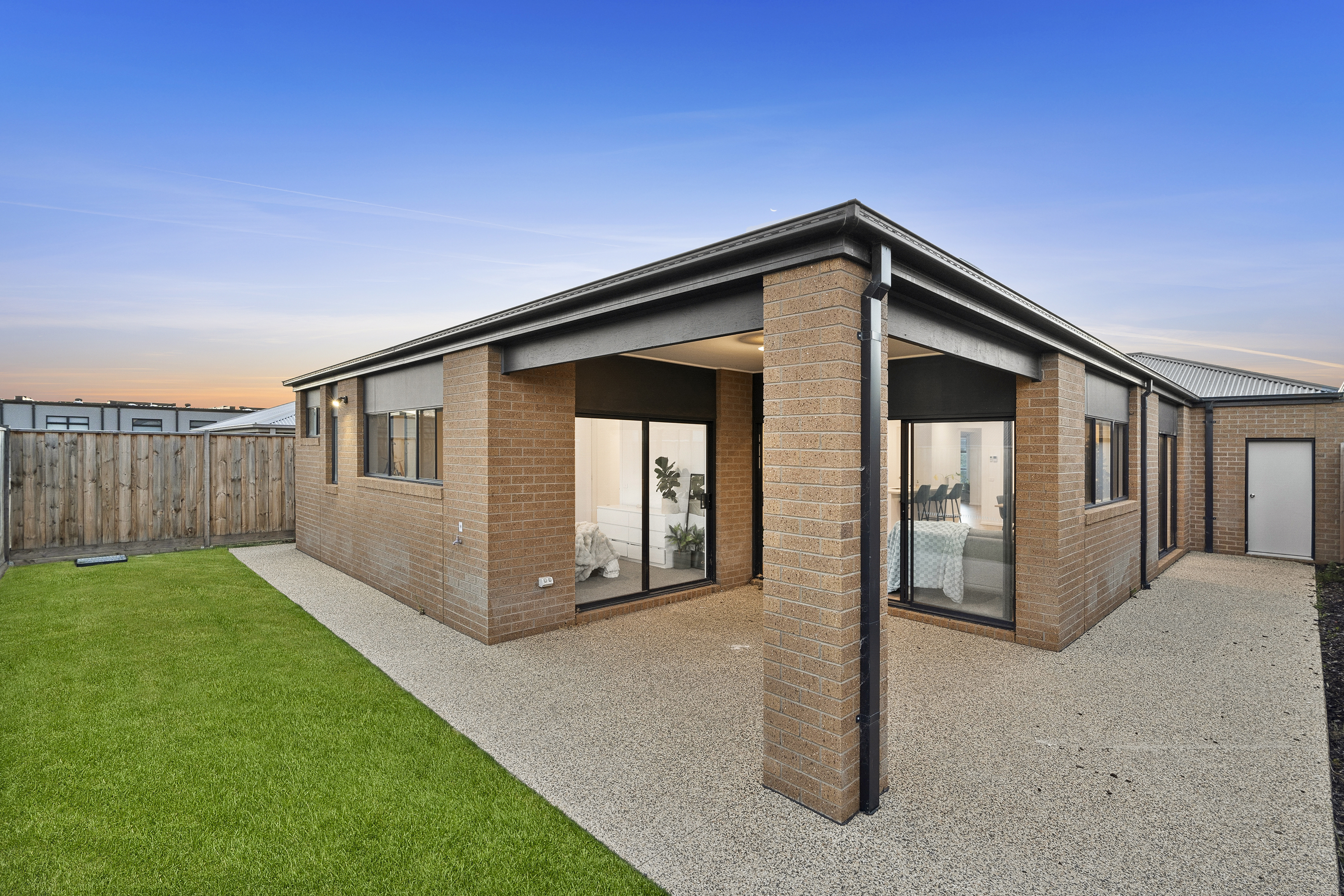 Outdoor: Low maintenance front and backyard, main living flowing through sliding stacker doors to outdoor entertaining space, backyard with alfresco and exposed aggregate concrete and grass area, exposed aggregate concrete paths surrounding house.