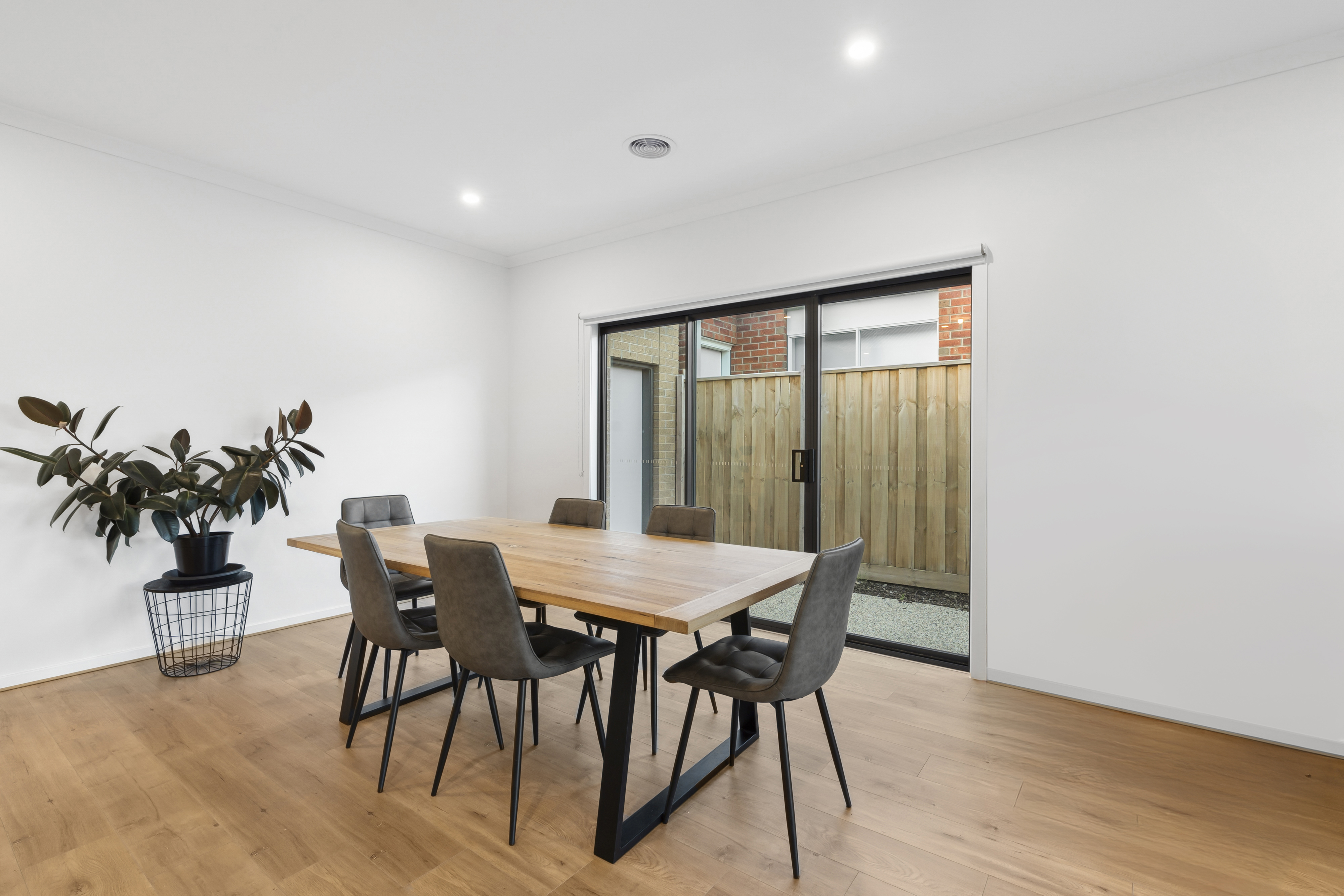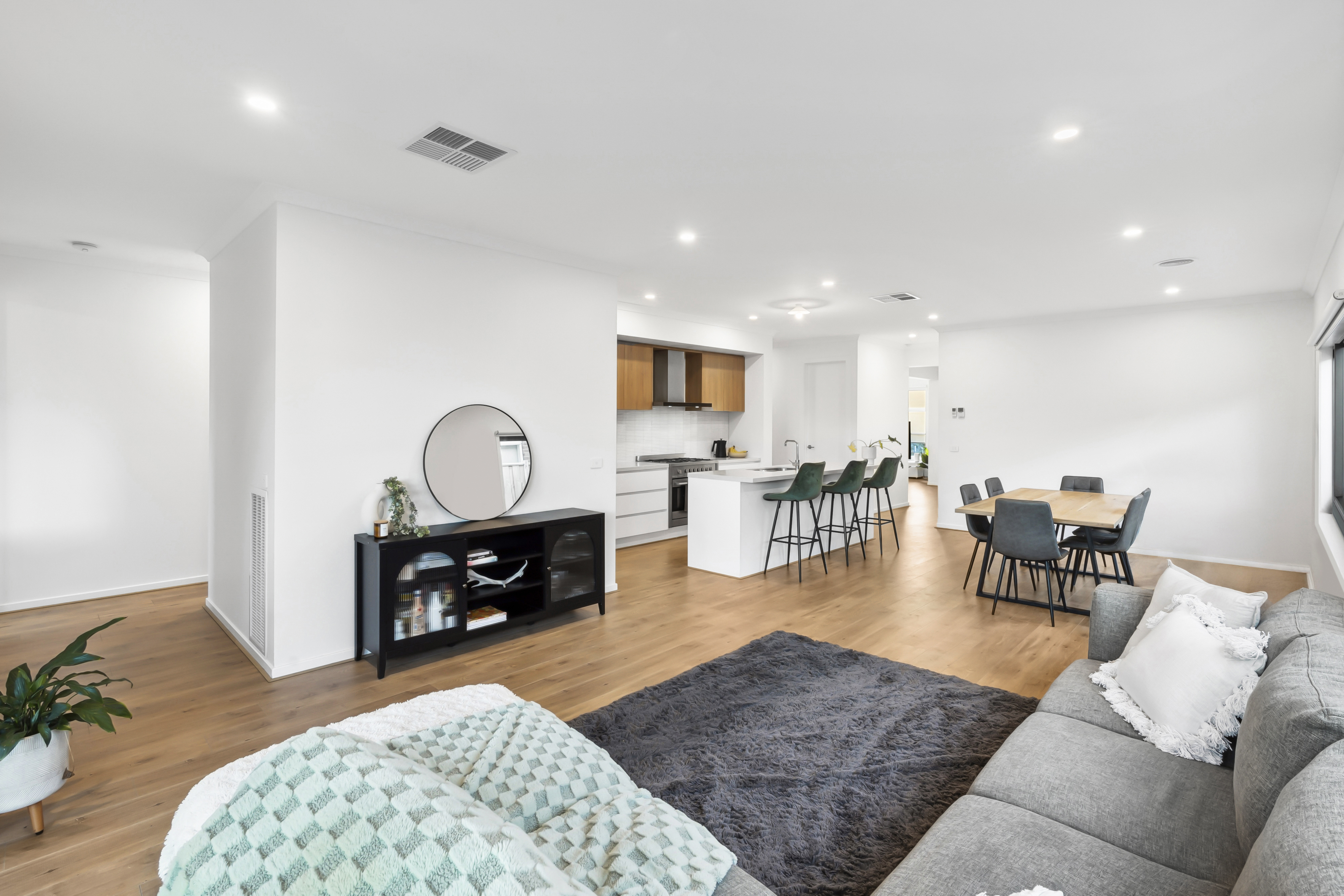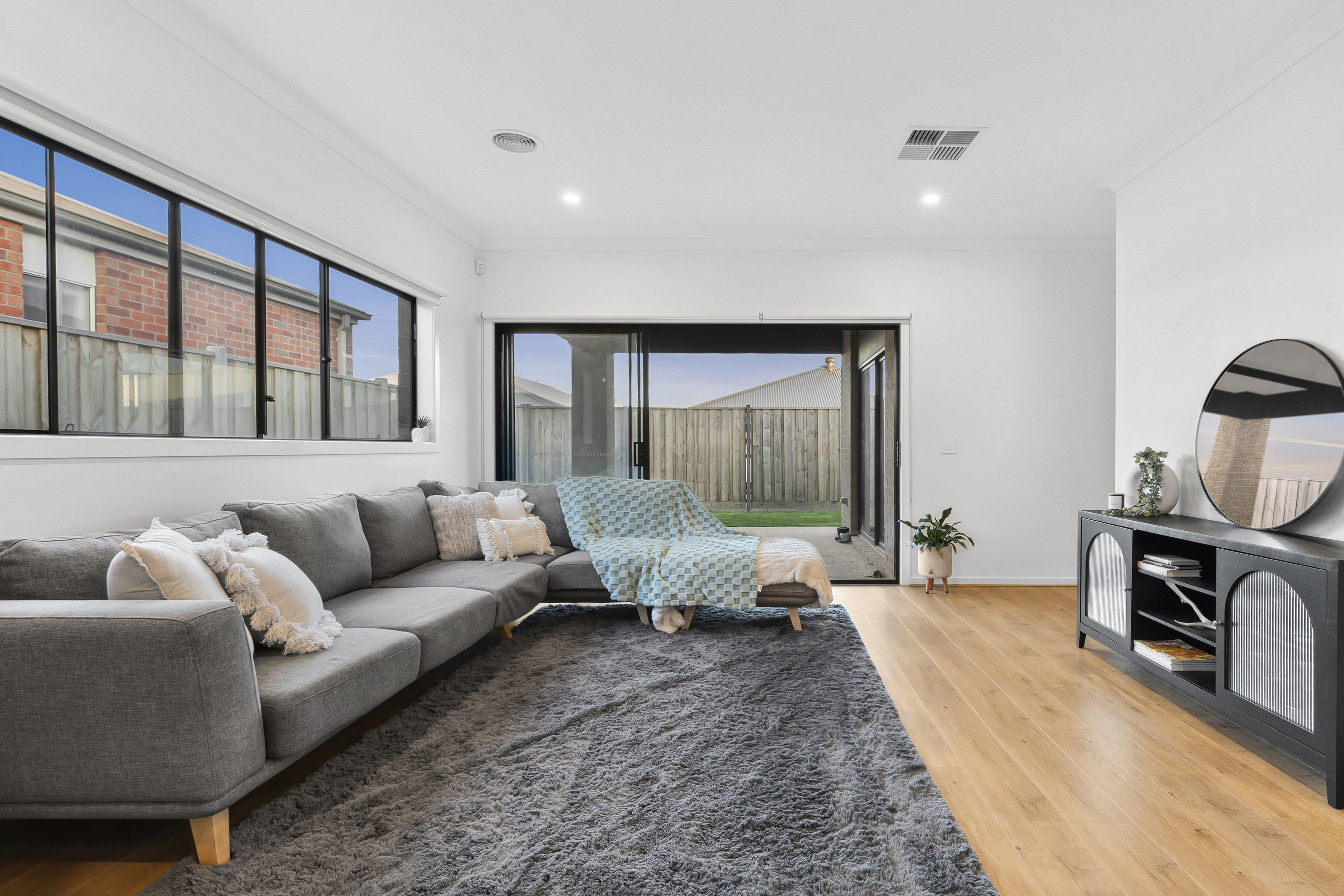 Living/Dining: Spacious open plan, raised ceilings with windows and sliding doors allowing natural northern sunlight, roller blinds, sliding-stacker doors to undercover alfresco with concrete, ducted gas heating, evaporative cooling & engineered wooden floorboards.