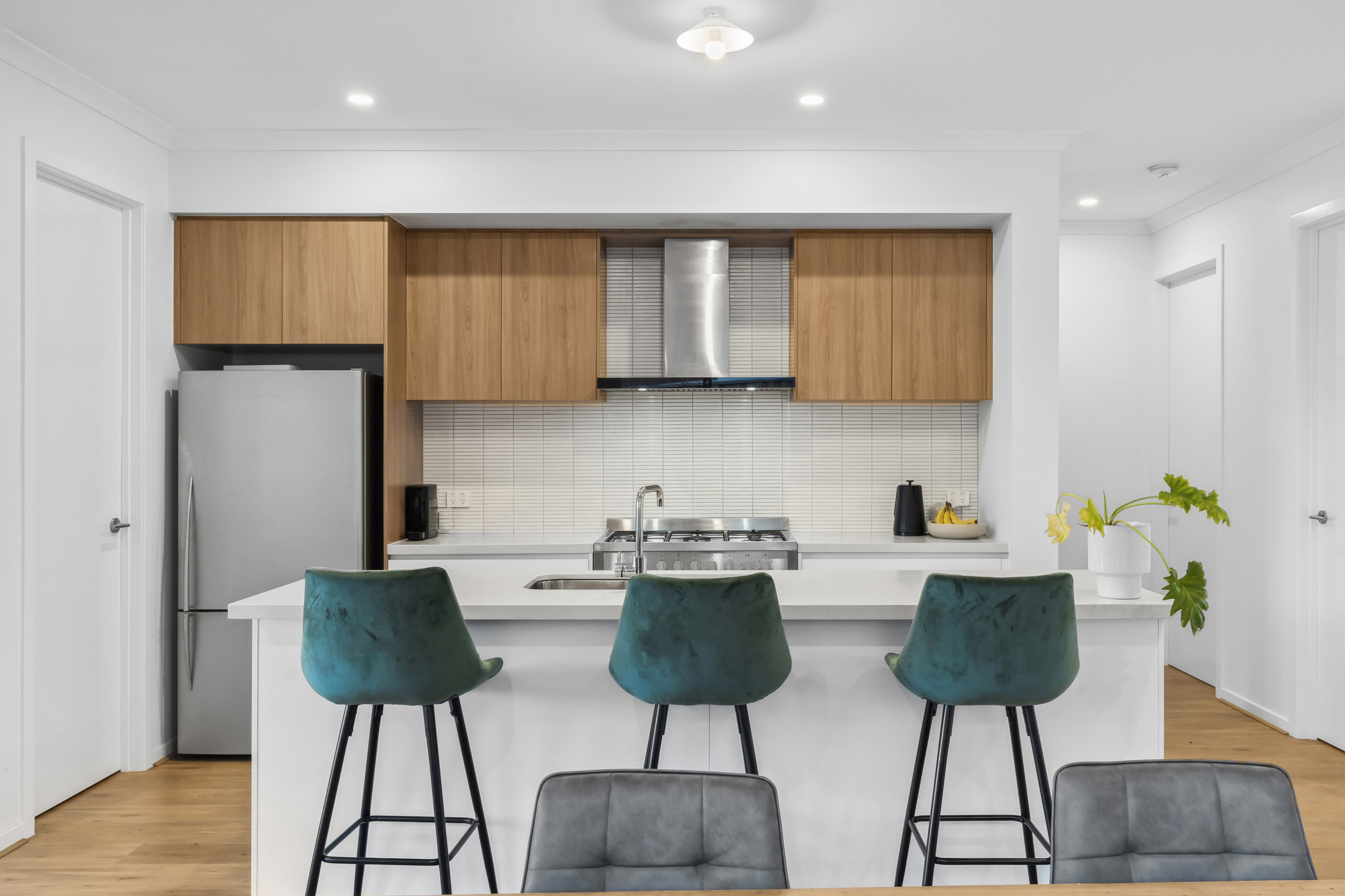 Kitchen: Island with 40mm stone benchtops and breakfast bar, dual undermount sink, upgraded 900mm gas cooktop/oven & rangehood, feature tile splashback, chrome fittings, dishwasher, batten lights as provision for feature pendant lighting, raised ceilings, downlights, ample storage incorporating pot drawers and spacious walk-in-pantry & engineered wooden floorboards.