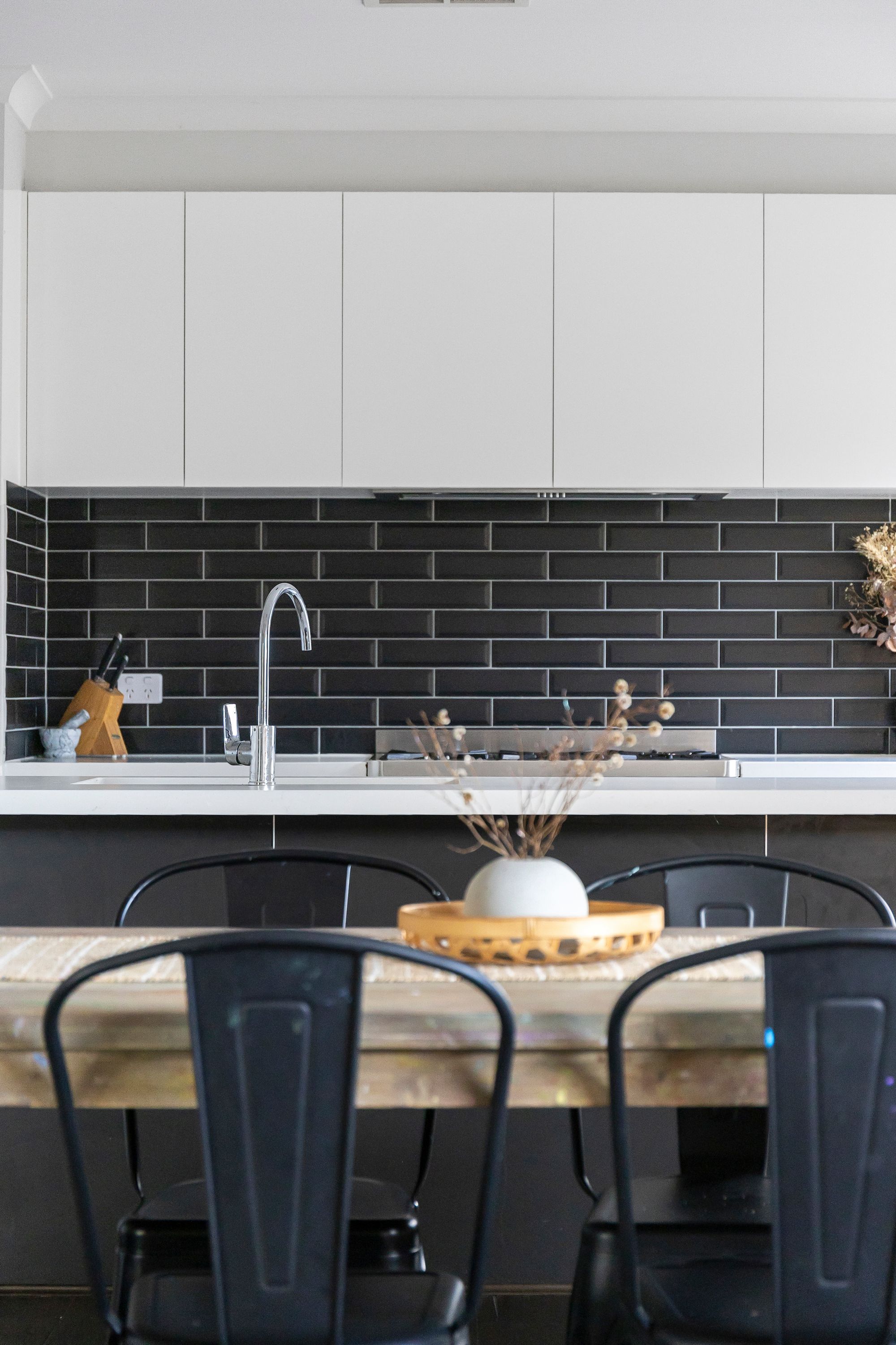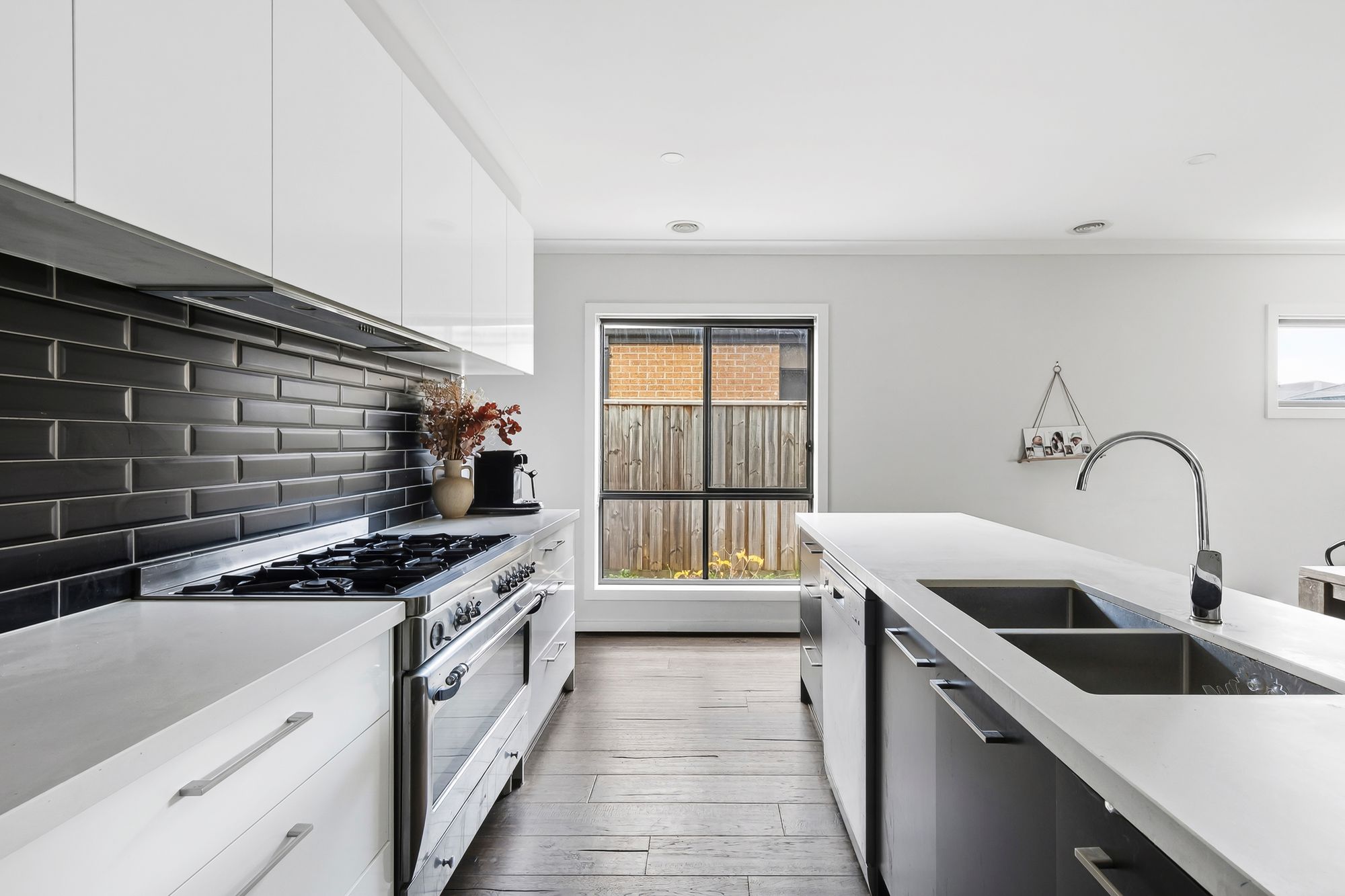 Kitchen – subway tiling splash back, dual under mount sink, island bench with breakfast bar overhang, 40mm stone bench top, walk in pantry, 900mm appliances, Italian made oven, overhead cabinetry, dishwasher, range hood, concealed rangehood, downlights & bamboo timber flooring.