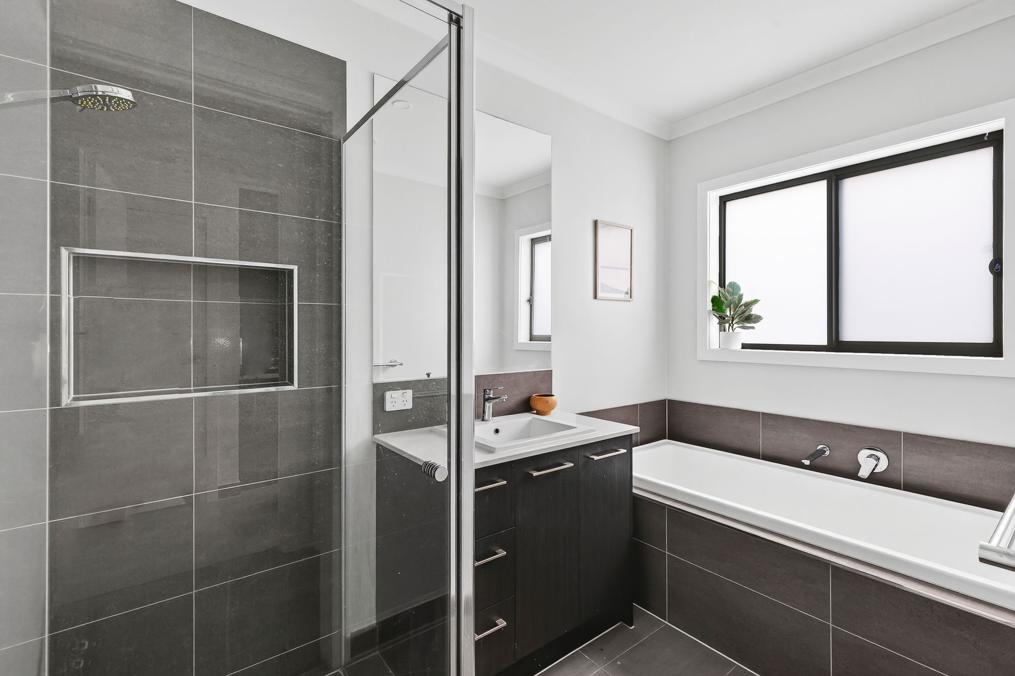 Main Bathroom – vanity, bath, semi frameless shower with niche, mirror and tile splashback & separate toilet.