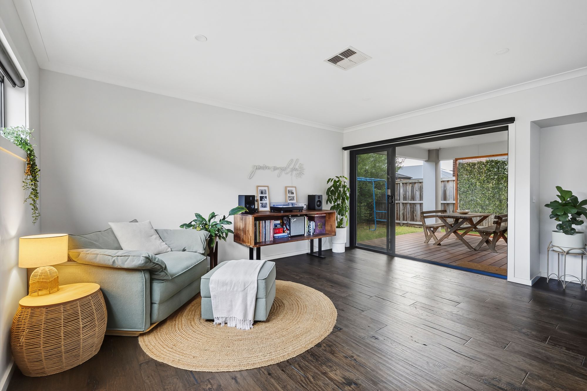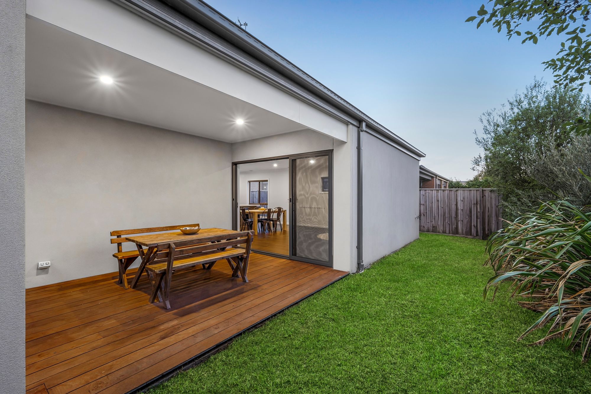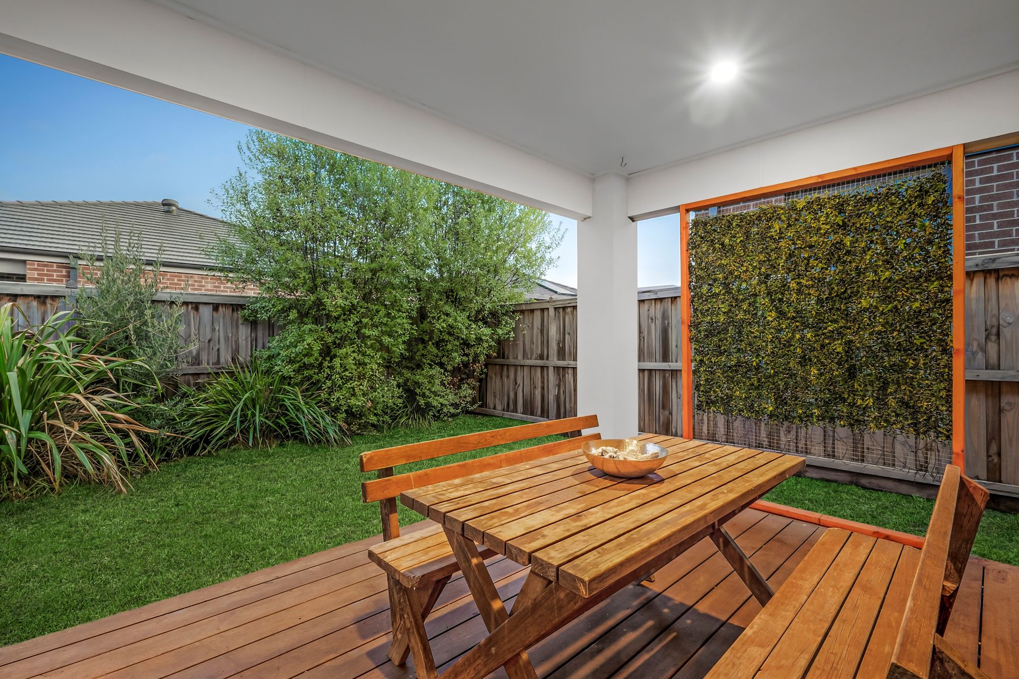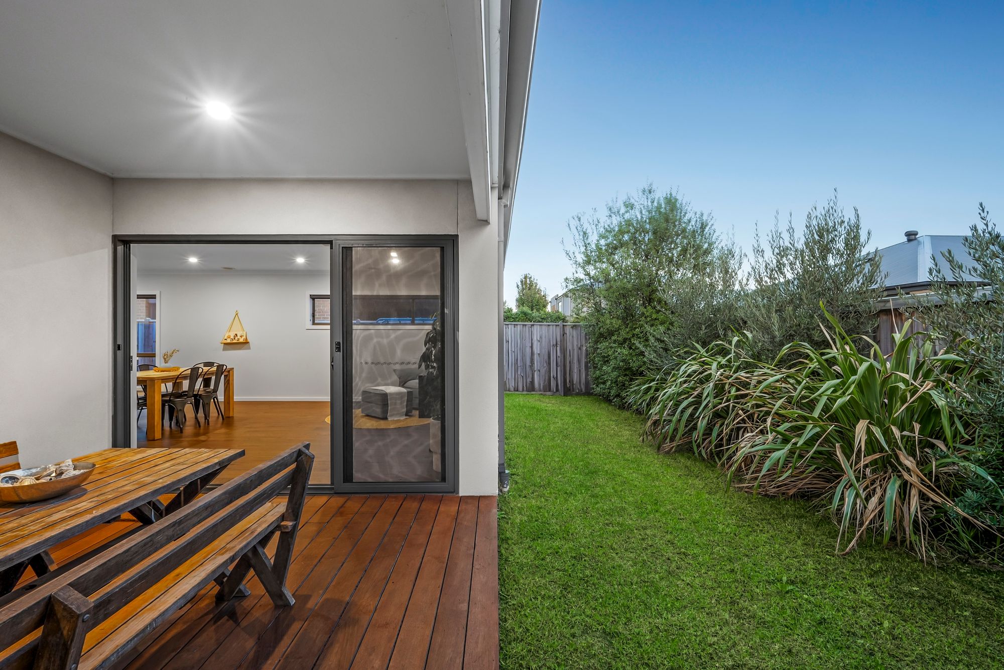 Outdoor – undercover alfresco through sliding stacker doors with decking & downlights, grassed area with established hedging for added privacy.