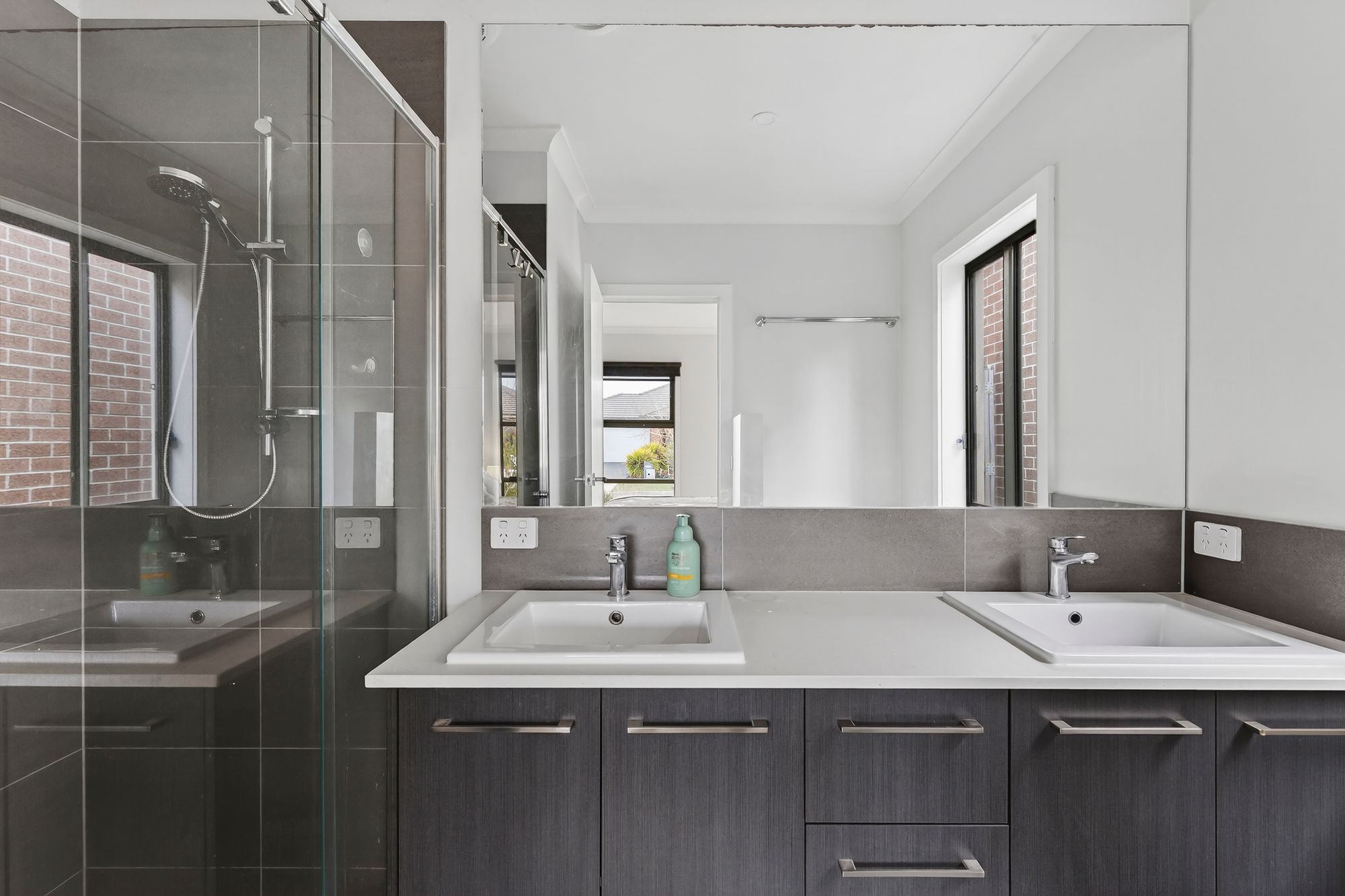 Ensuite – dual basins and extended vanity, mirror and tile splashback, extended semi frameless shower with niche, ample storage & toilet.