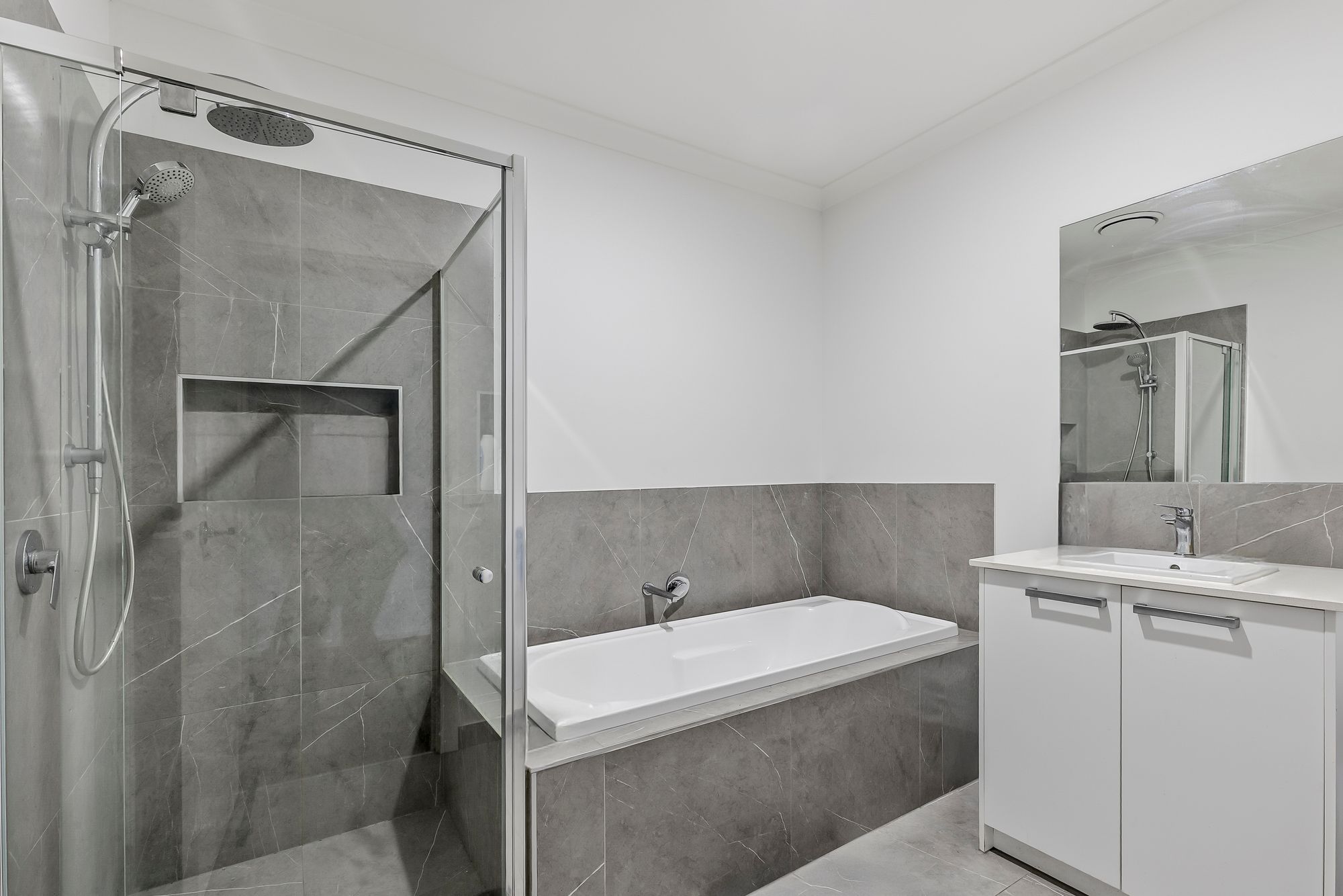Main bathroom: Tiled, semi frameless shower, single basin and vanity with mirror splashback, bath, 20mm stone benchtops, chrome fittings, separate toilet.
