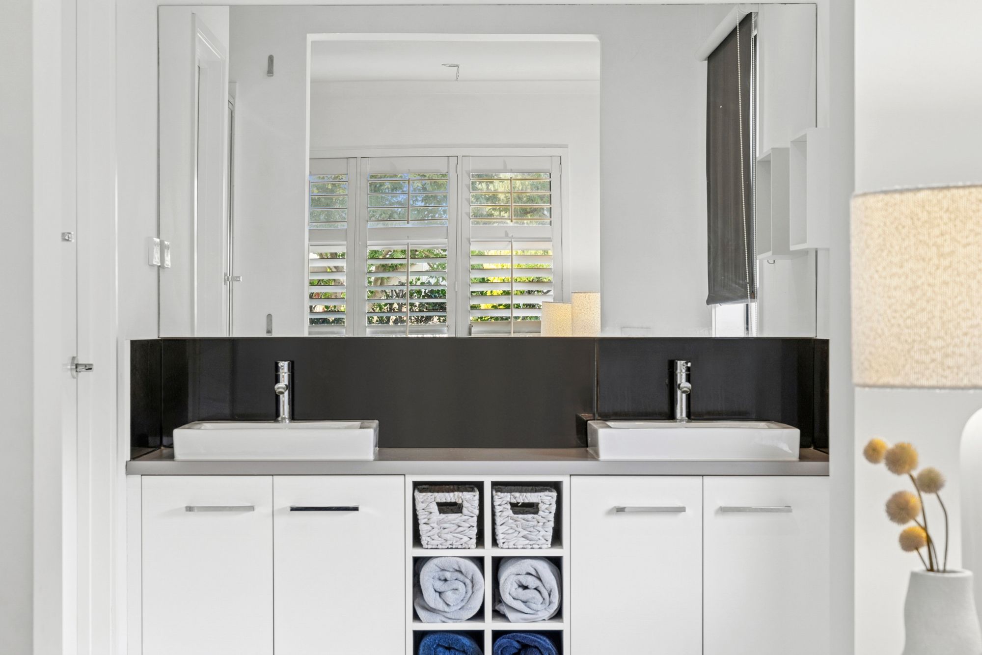 Tiled, double semi-frameless shower containing hand-held shower head, oversized mirror splash back, twin vanity with ample storage, chrome fittings, downlights, ceiling fan, towel holder, private toilet