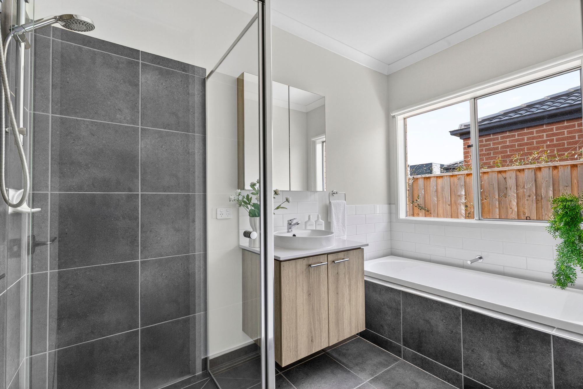 Main Bathroom – Semi-frameless fully tiled shower with niche, upgraded fittings, bath, feature basin with 20mm stone benchtop, mirrored cabinetry, tile splashback, separate toilet, and roller blinds.
