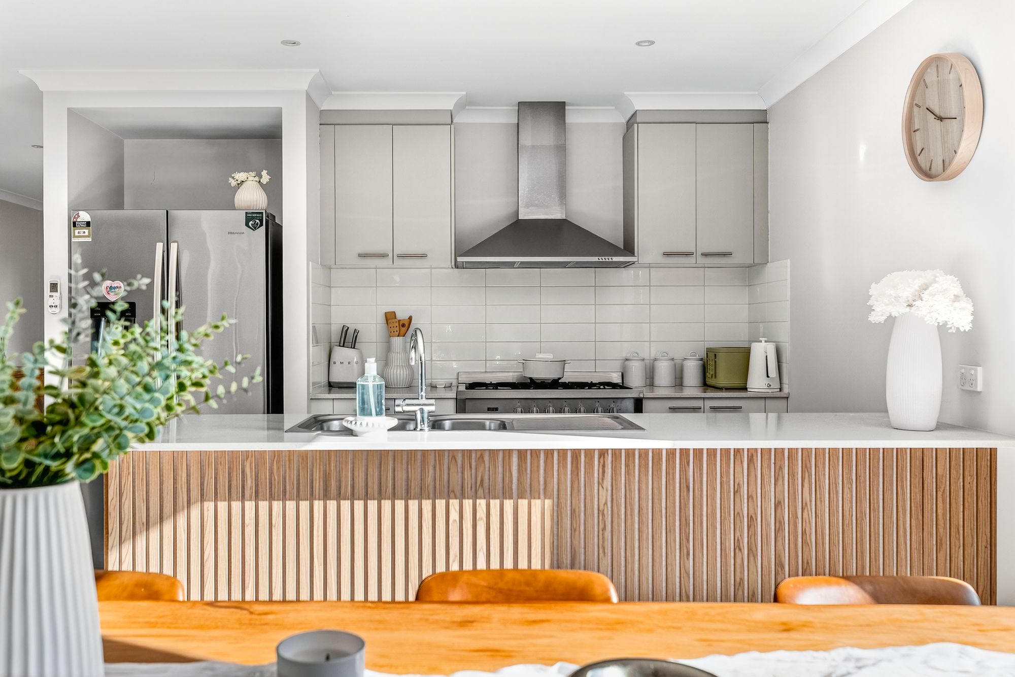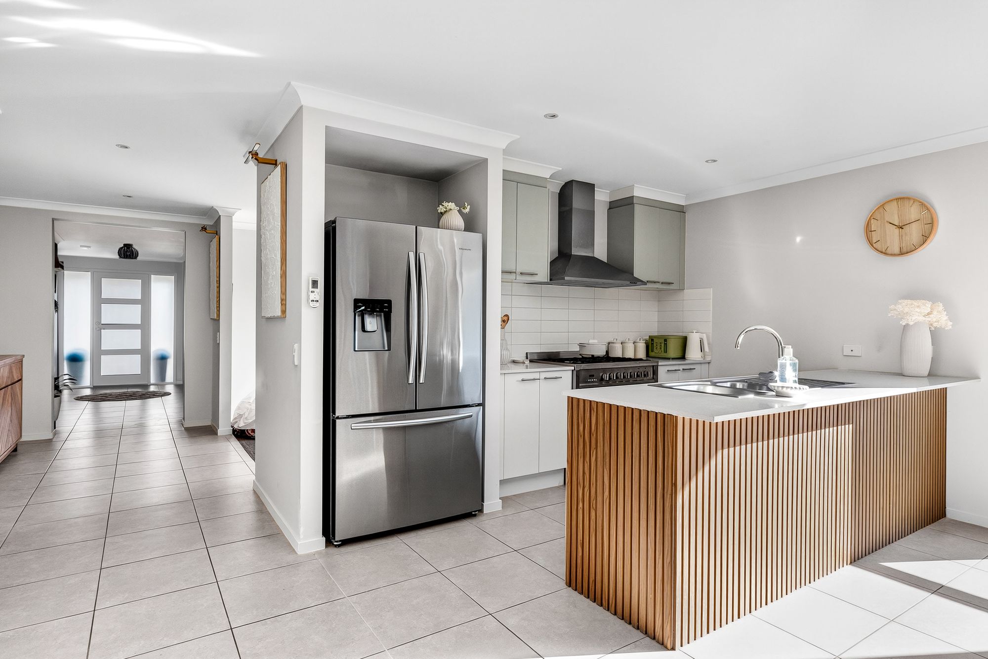 Kitchen: 900mm stainless steel gas cooktop, oven & rangehood, built in pantry with shelving, fridge cavity with plumbed in water point, 20mm stone benchtops, double sink, chrome finishes, overhead cabinetry, feature wooden detail underneath bench, storage drawers, tile splash back, tile flooring, island bench with overhang breakfast bar, dishwasher.