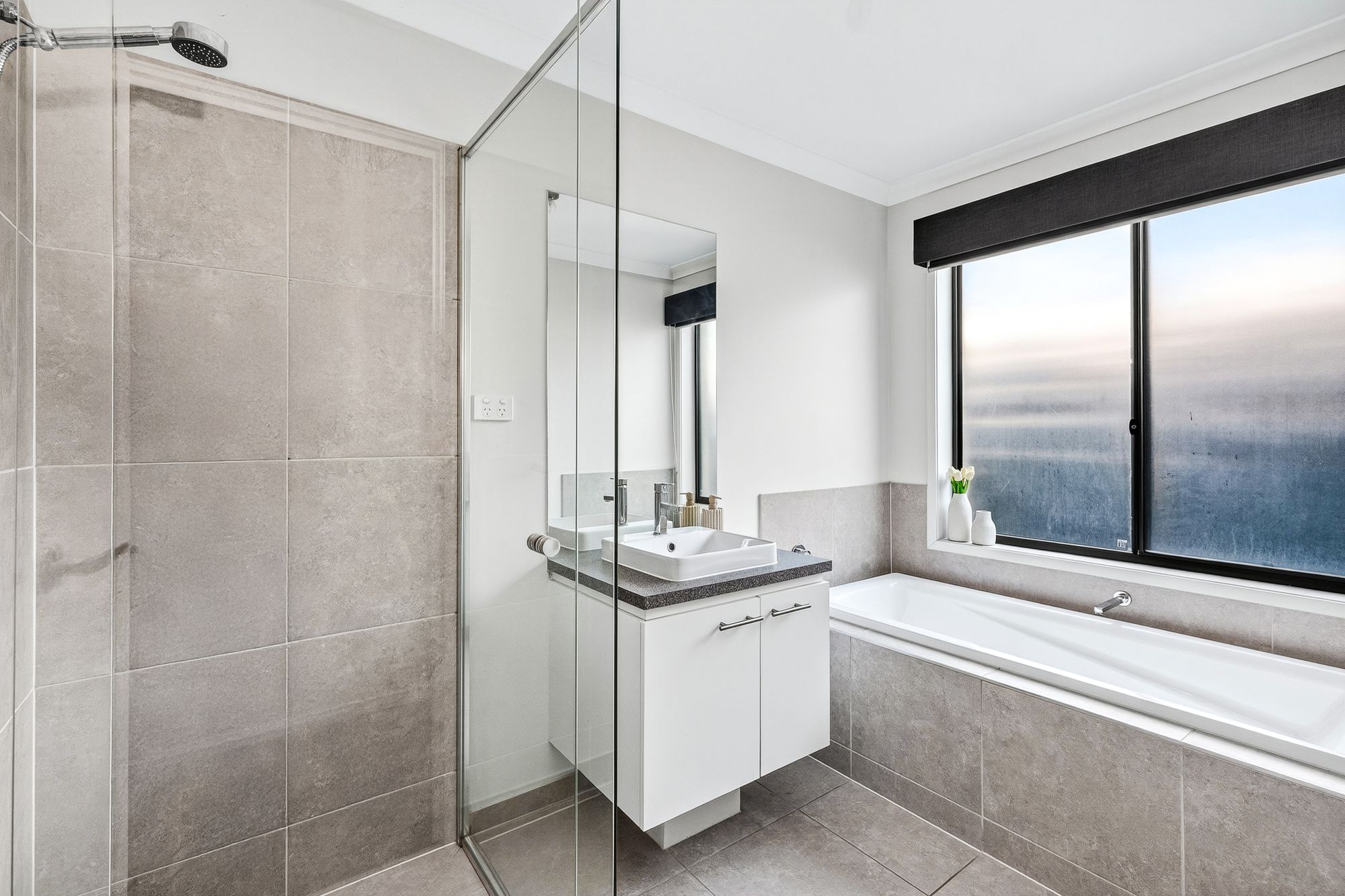 Main bathroom: semi frameless shower, bath, tiles, basin and vanity, tile and mirror splashback, seperate toilet