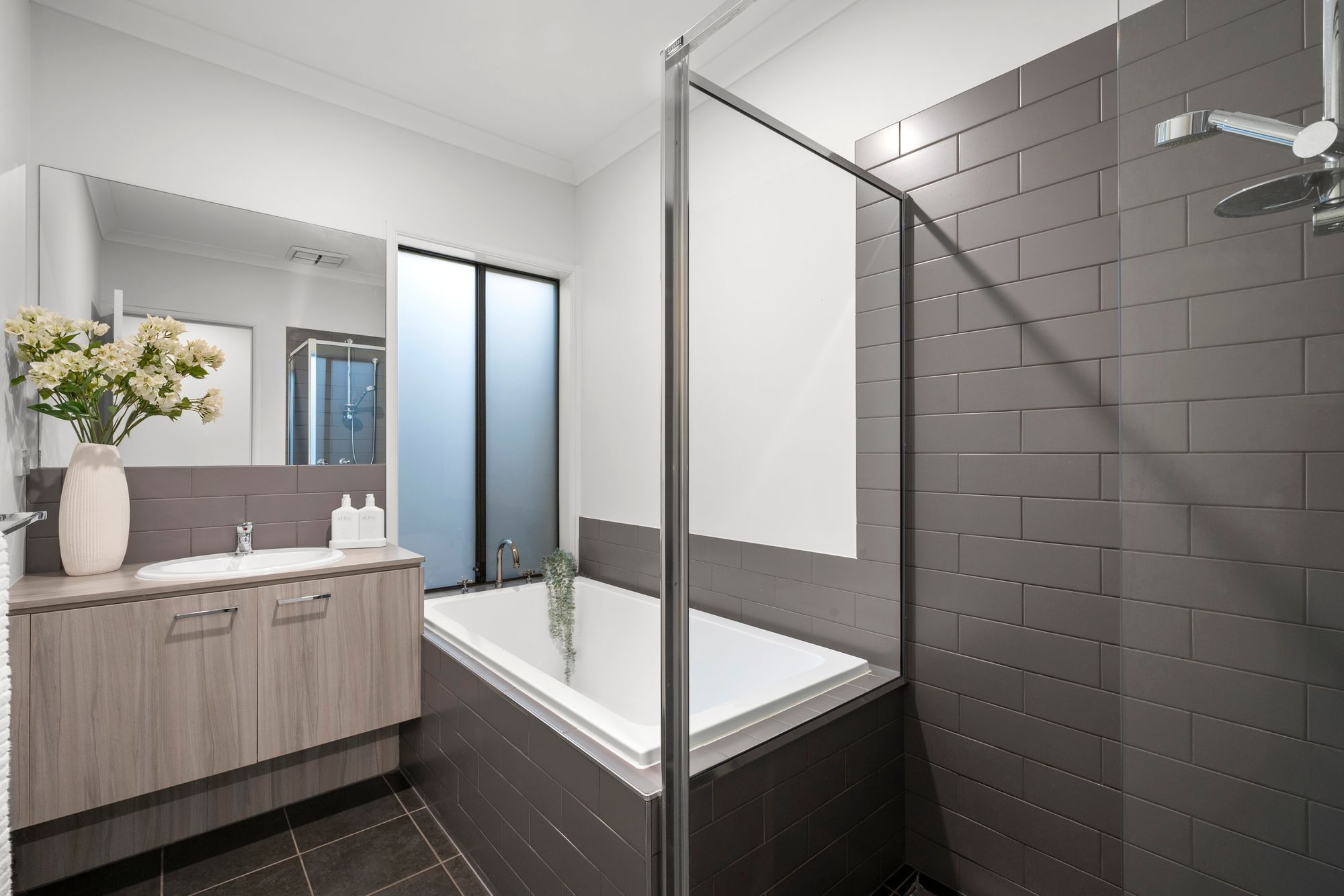 Tiled, large semi-frameless shower containing hand-held shower head, tiled bath, mirror splashback, single vanity with ample storage, downlights, exhaust fan, towel holder, private toilet, frosted window, downlights