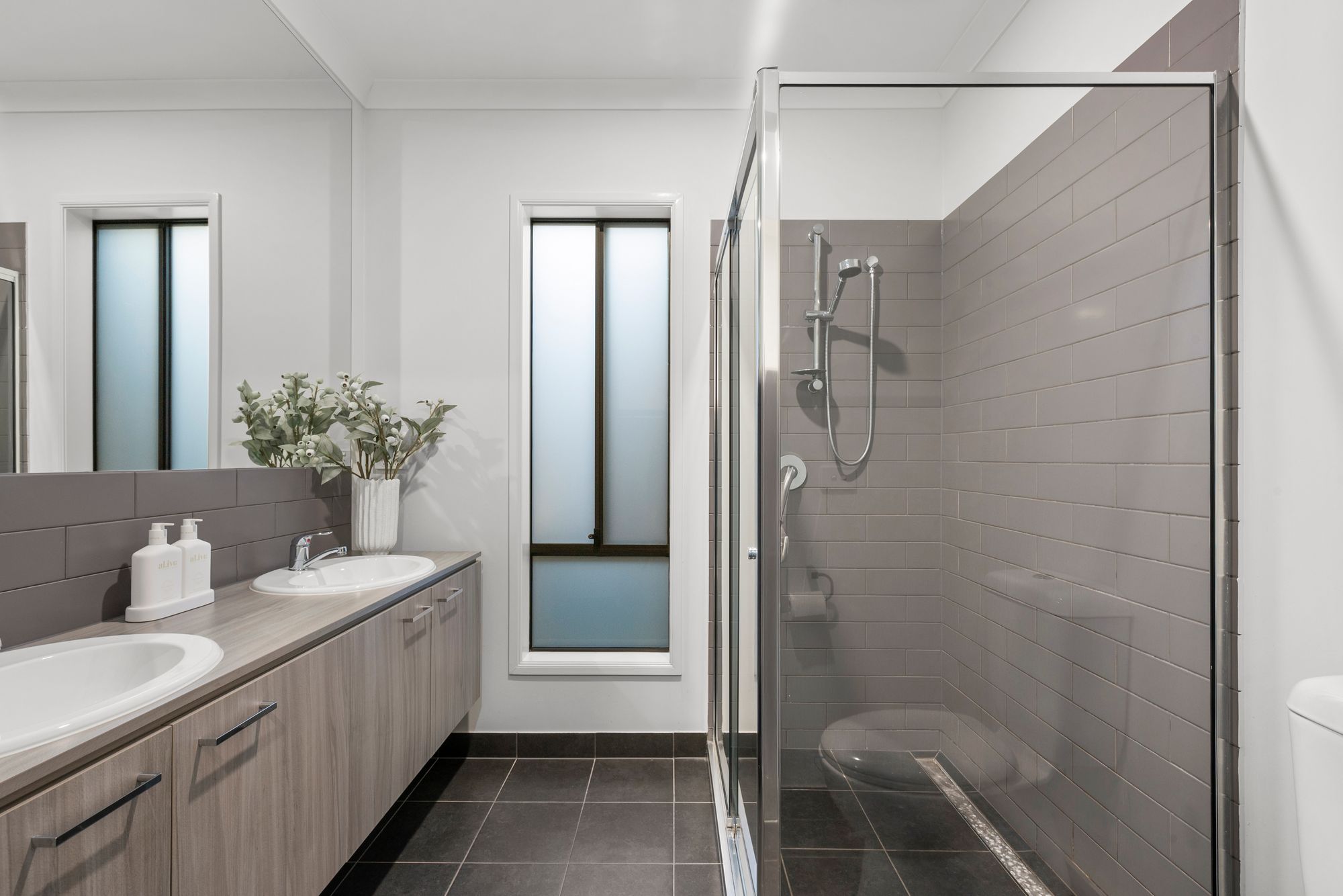 Tiled, large semi-frameless shower containing hand-held shower head, oversized mirror splashback, large double vanity with ample storage, downlights, exhaust fan, toilet, frosted window, tiled splashback, downlights,