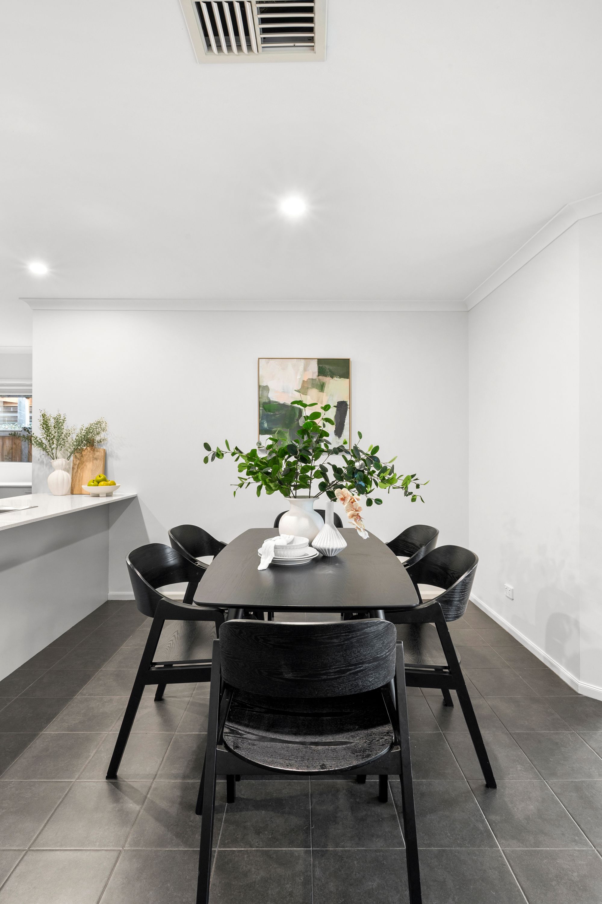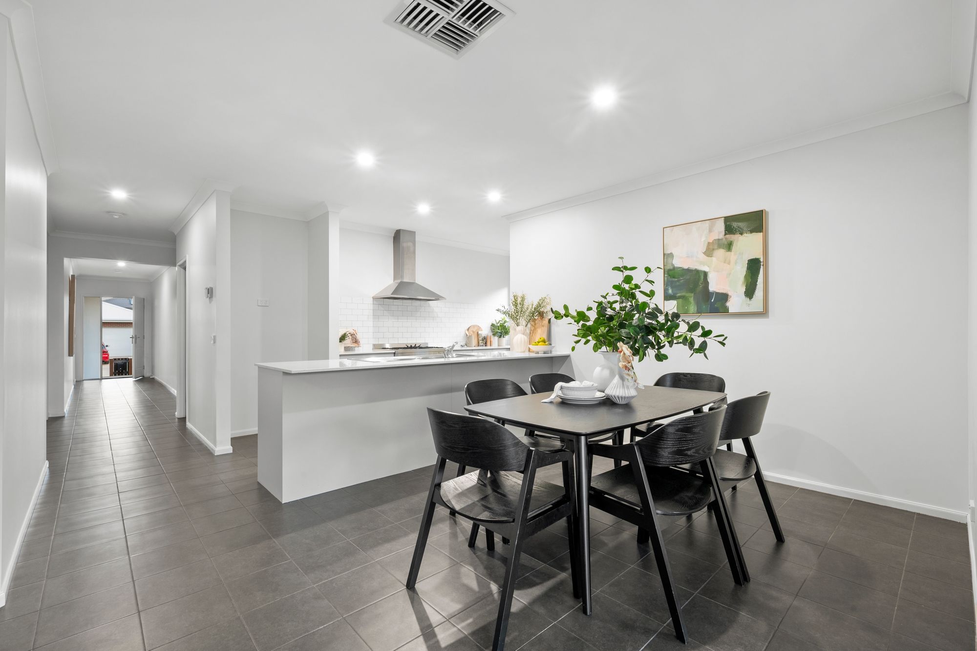 Open-plan living/dining, tiled flooring, downlights, high ceilings, roller blinds, sliding door to alfresco, evaporative cooling, ducted heating, multiple powerpoints, TV antenna point, and adjoining second living space.