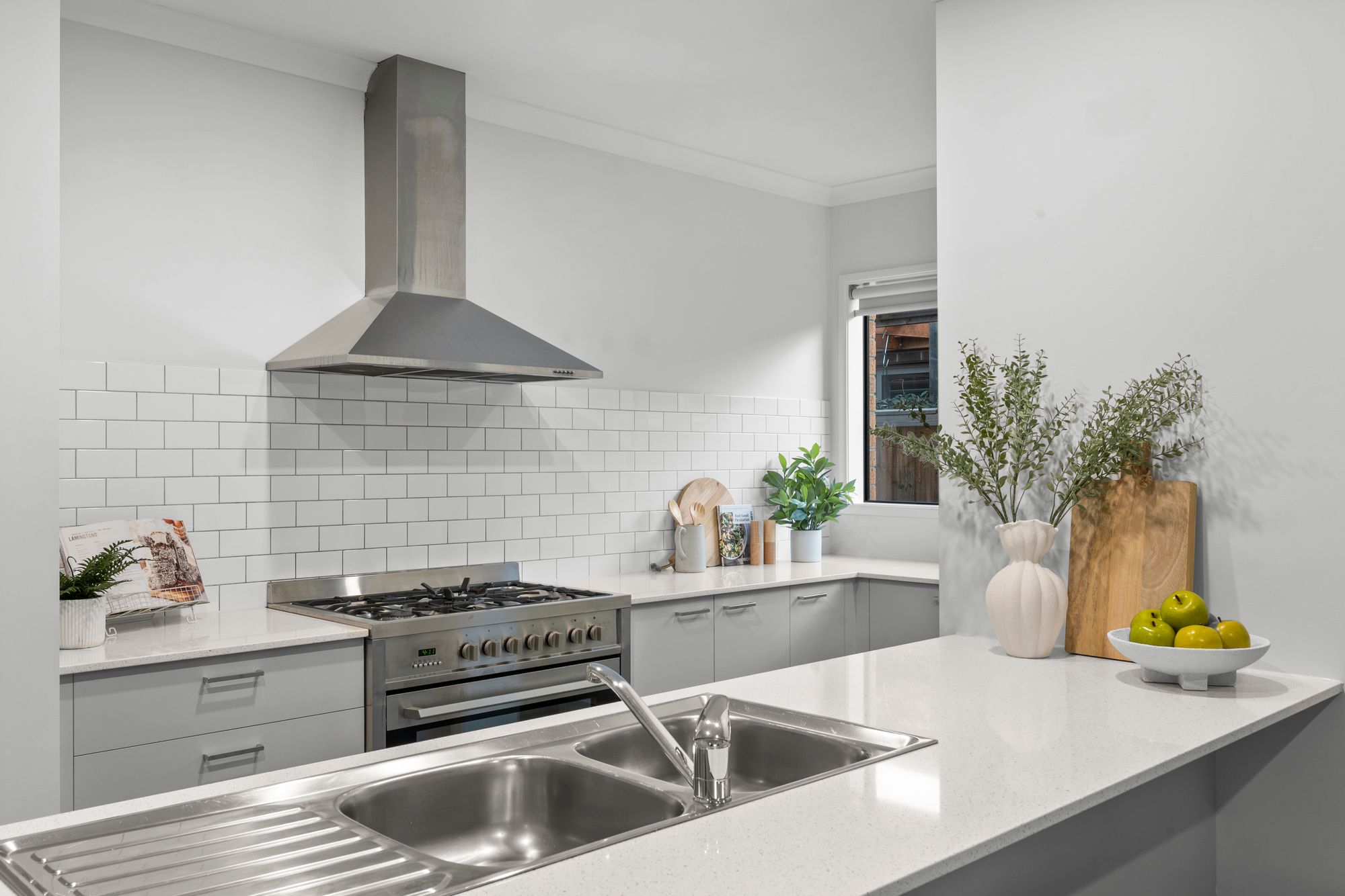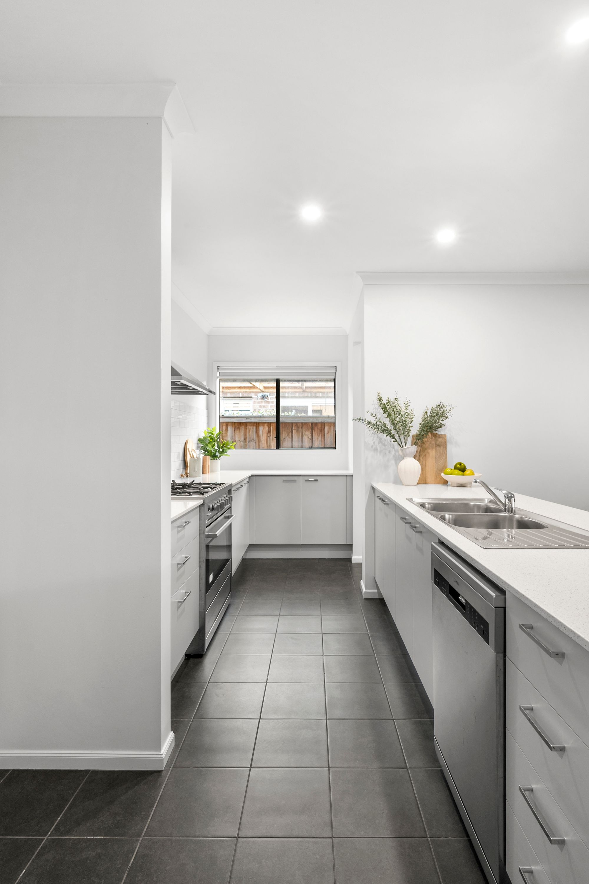 Featuring an expansive kitchen with 20mm stone benchtops, 900mm freestanding oven and gas cooktop, rangehood, dual overmount stainless sink, ample storage, walk-in pantry, window with roller blind, fridge cavity, microwave provision, brick style tiled splashback, high ceilings, downlights, tiled flooring,