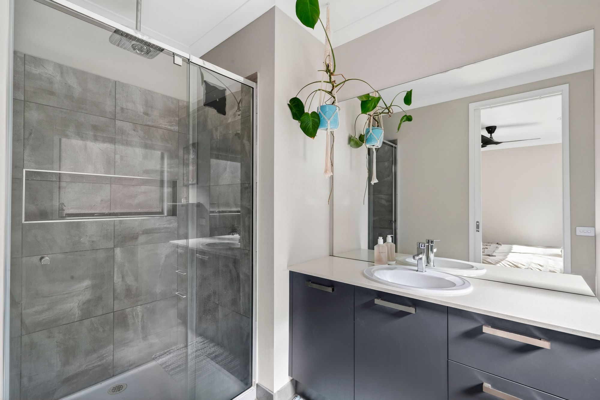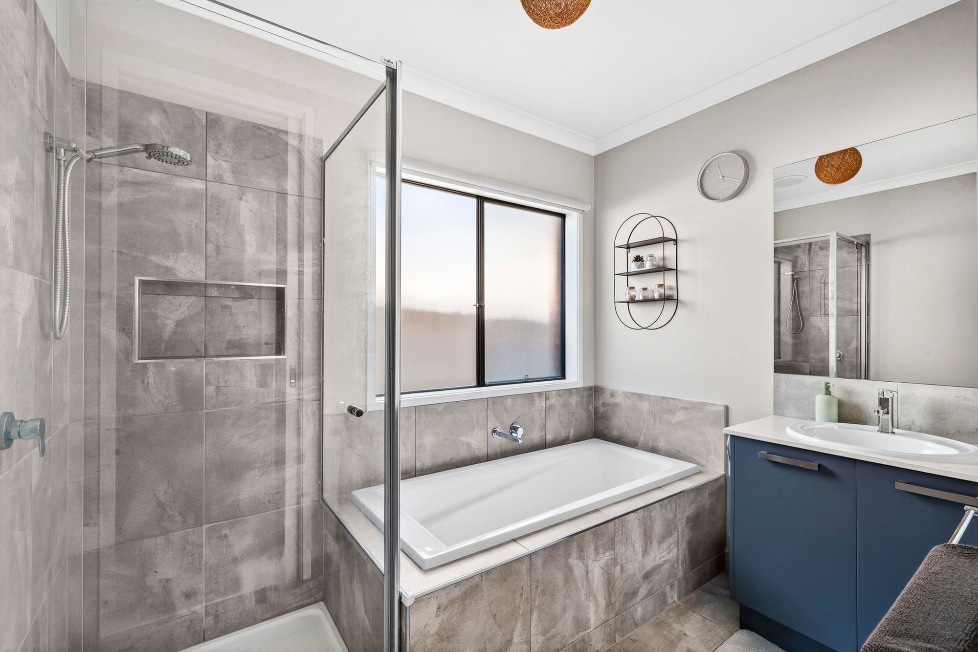 Ensuite: 20mm stone bench tops, extended shower, rainfall shower head, extended niche, 20mm extended stone bench top, single vanity with additional drawer storage, upgraded tiles, towel rack, frosted window, heat light, cavity slider, open toilet.
