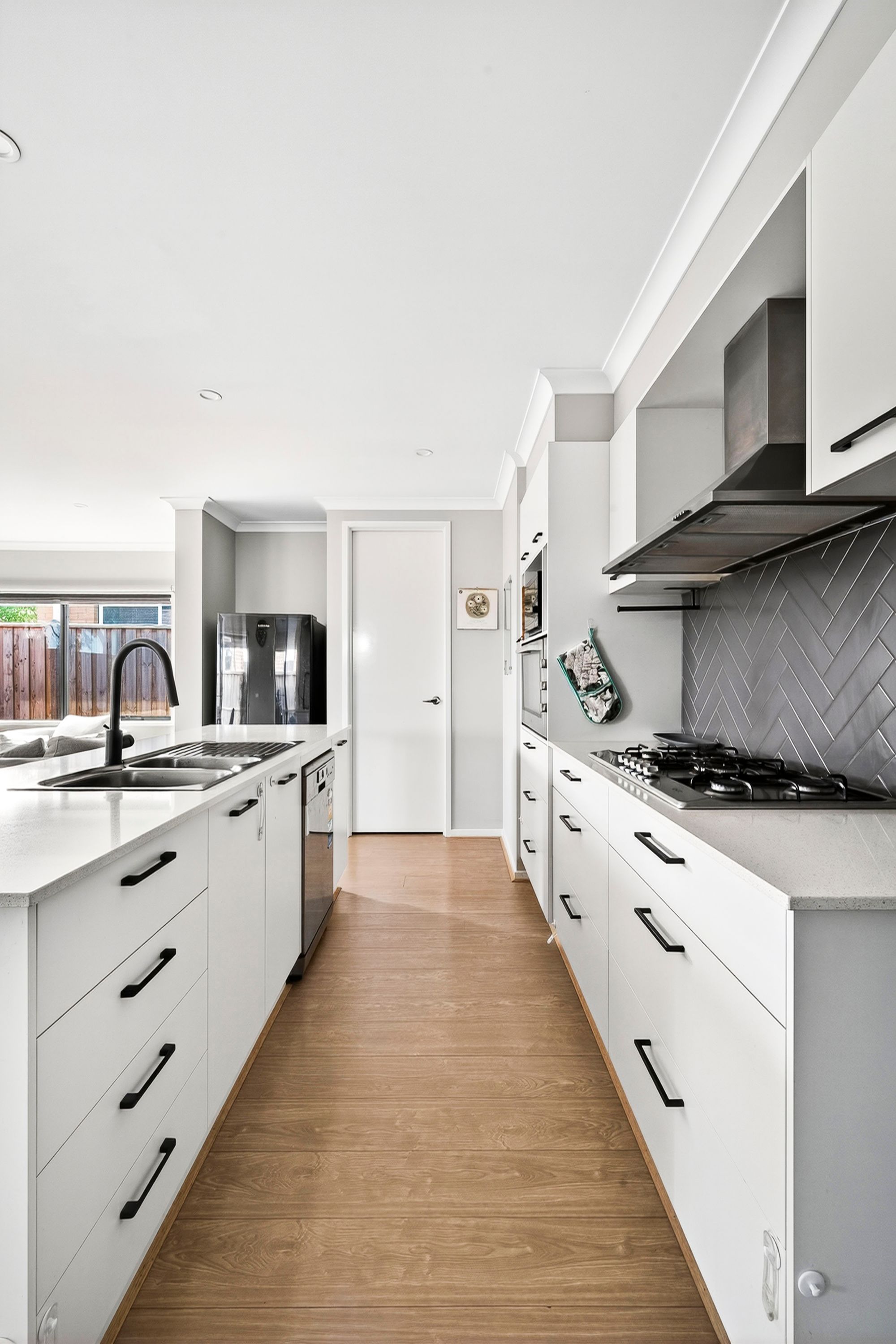 Kitchen: 20mm stone island bench tops, upgraded black tapware, black handles, walk in pantry, wall oven tower, drawers, 900mm built in stove cooktop, tiled splashback, dishwasher, multiple PowerPoints, range hood, pull out bin, hybrid flooring.