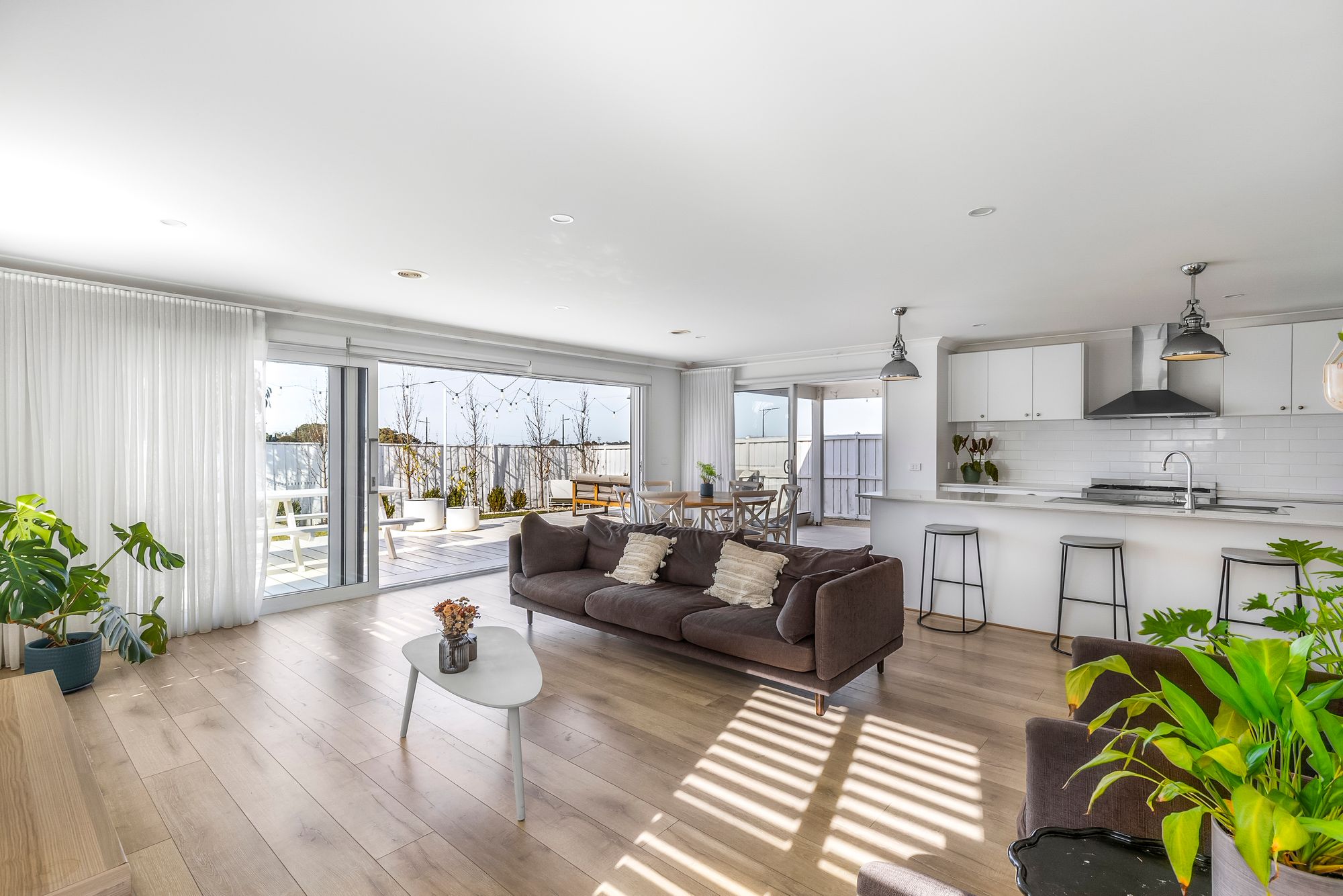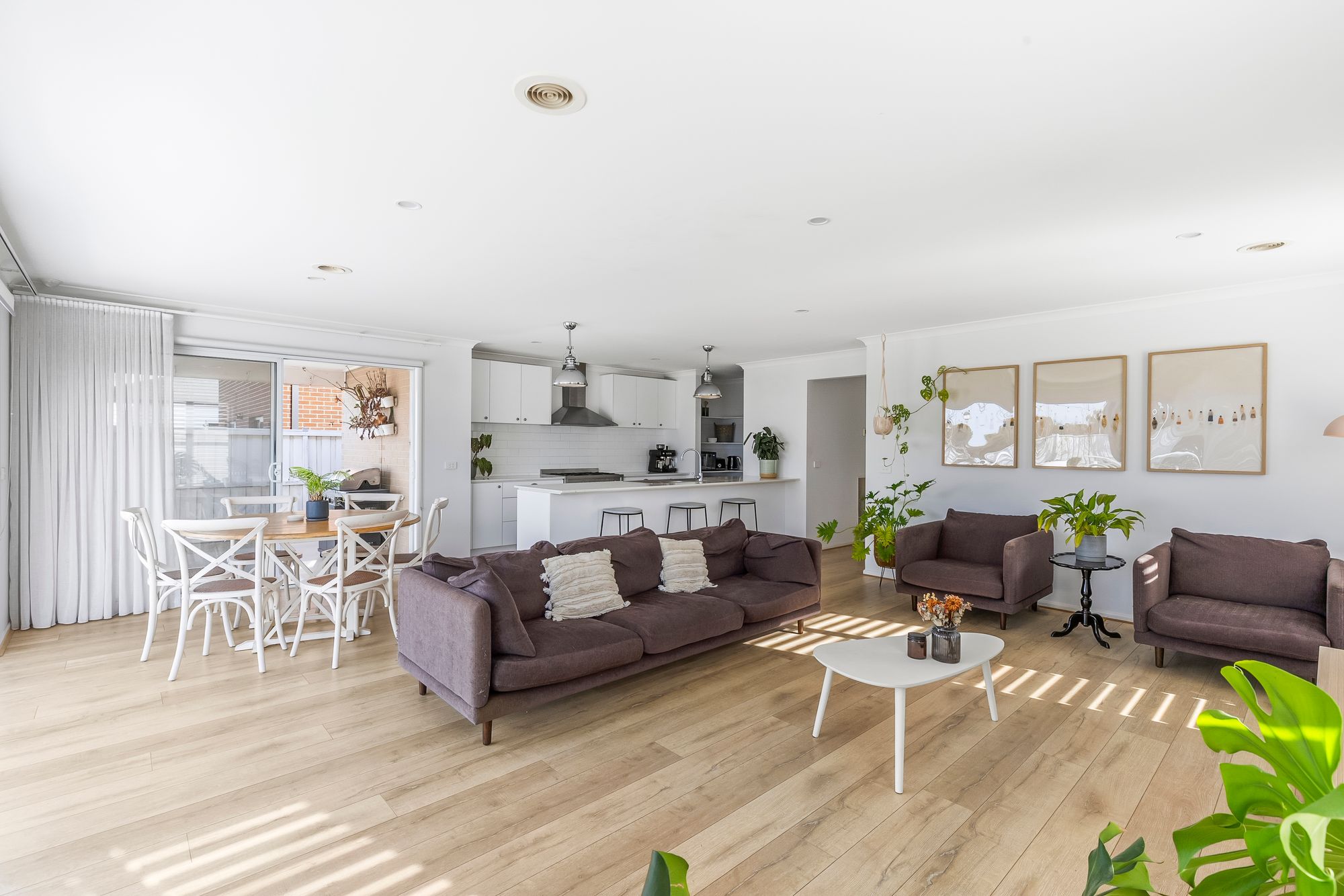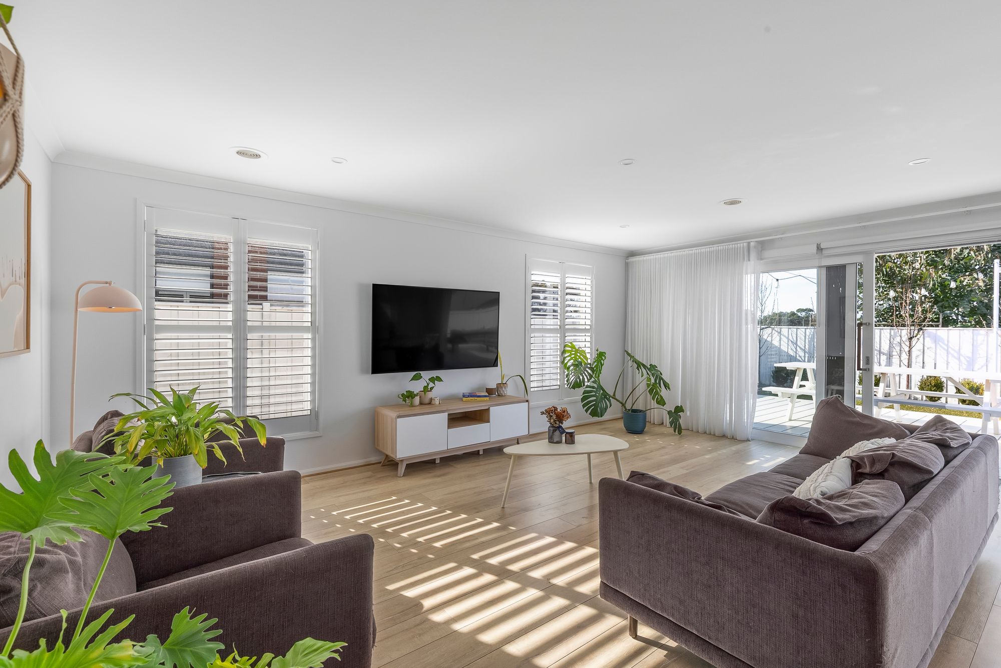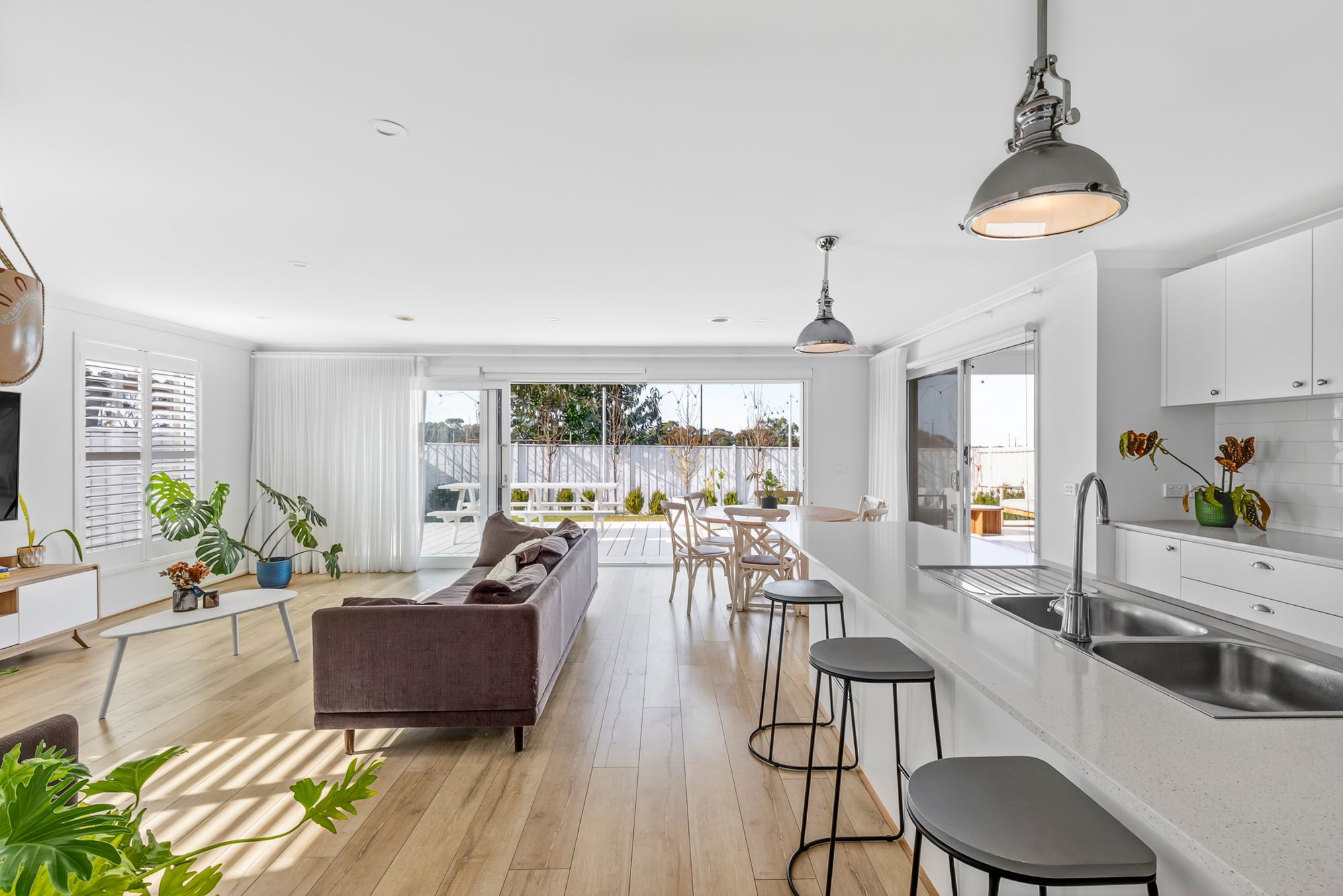 Open Plan Living/Dining: The open-plan hub of the home features hybrid flooring, plantation shutters, downlights, and seamless indoor-outdoor flow with both sliding doors to the side and stacking sliding doors to the rear. Ducted heating ensures year-round comfort.