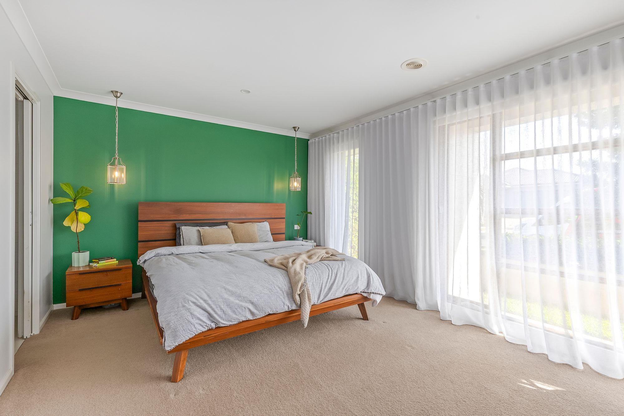 Master Suite: Retreat in style to a master suite that boasts sheer curtains and blockout blinds, elegant pendant lighting, a stunning feature wall, and plush soft carpet underfoot. A spacious walk-in robe and downlights complete the space for functionality and warmth. Enjoy a luxurious ensuite featuring a wide walk-in shower, floor-to-ceiling tiles with square-set finish, open toilet design, and a sleek 20mm stone-top vanity.