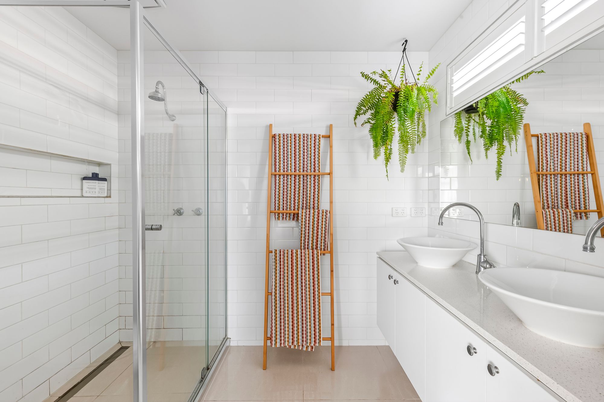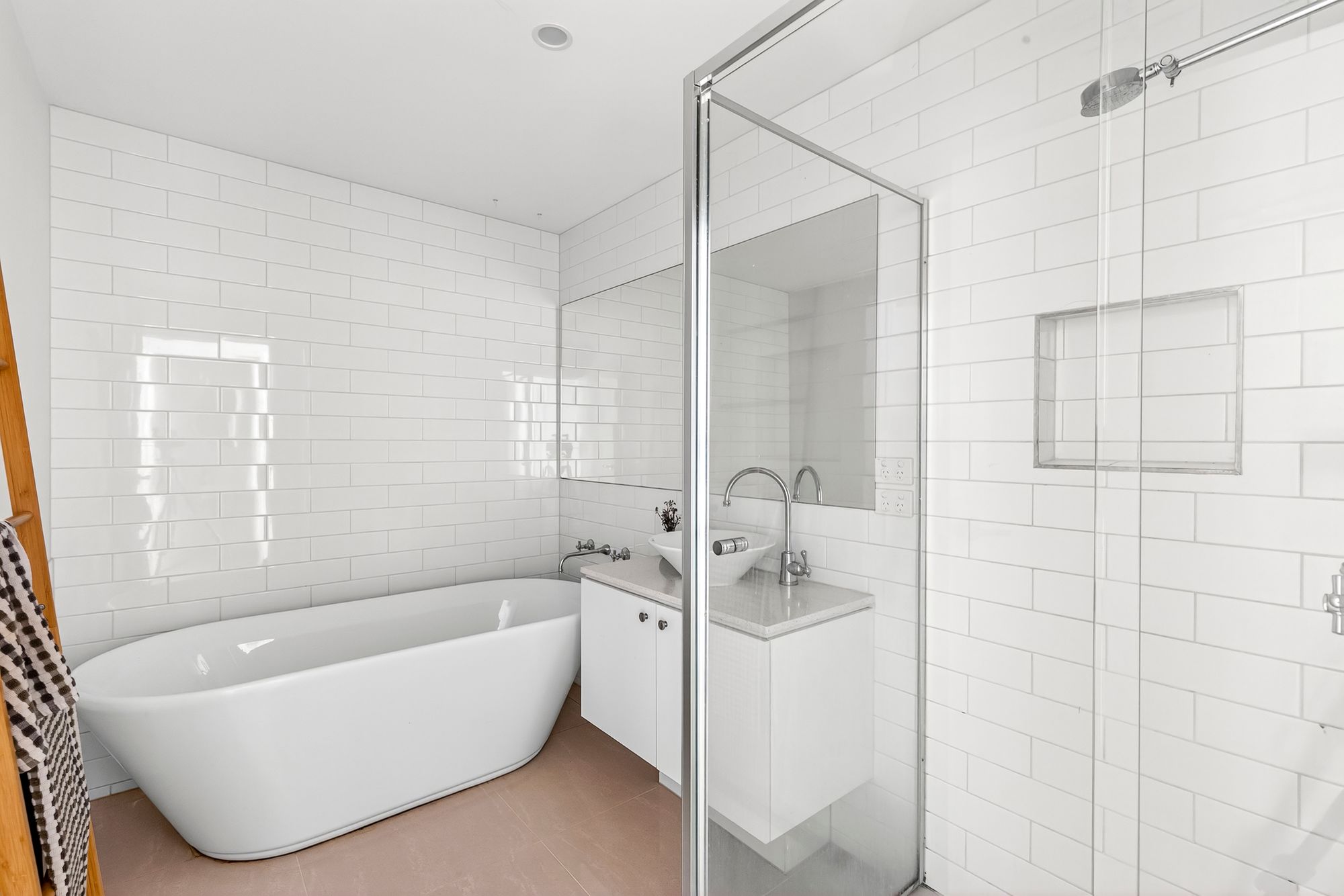 Additional Bathroom: Stylish and functional, the family bathroom includes a freestanding bath, 20mm stone single vanity, floor-to-ceiling tiling, and a shower with built-in niche for storage.