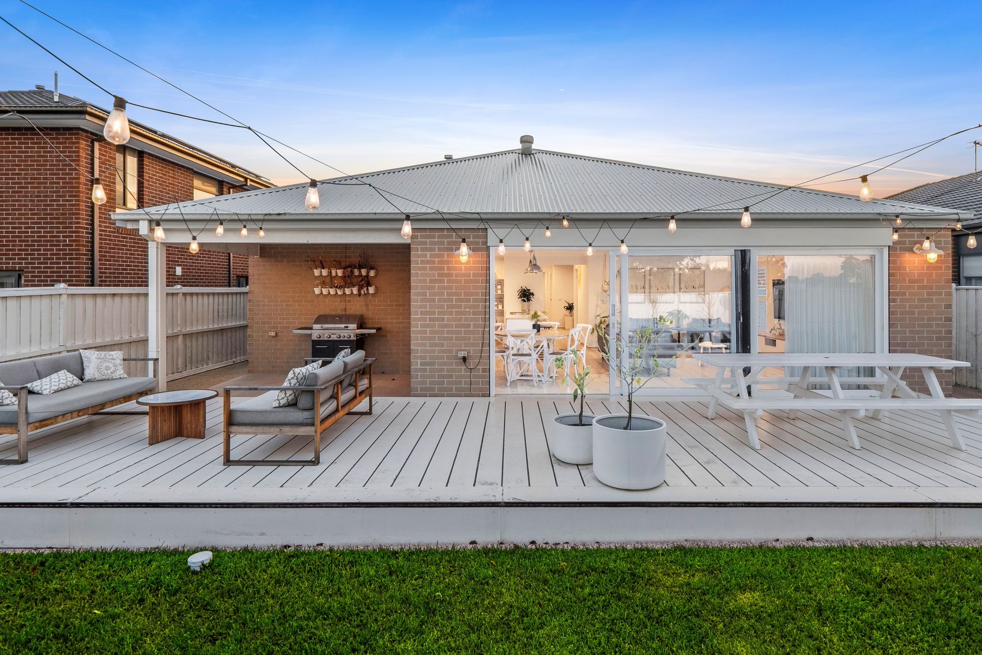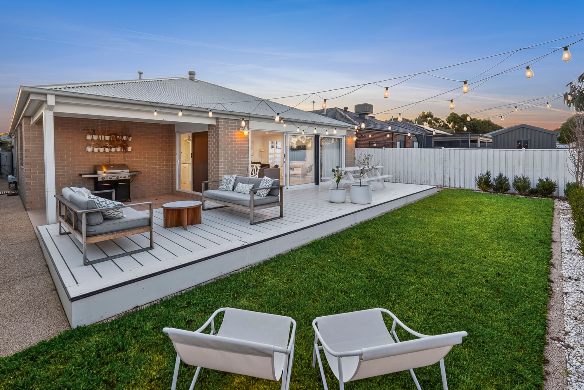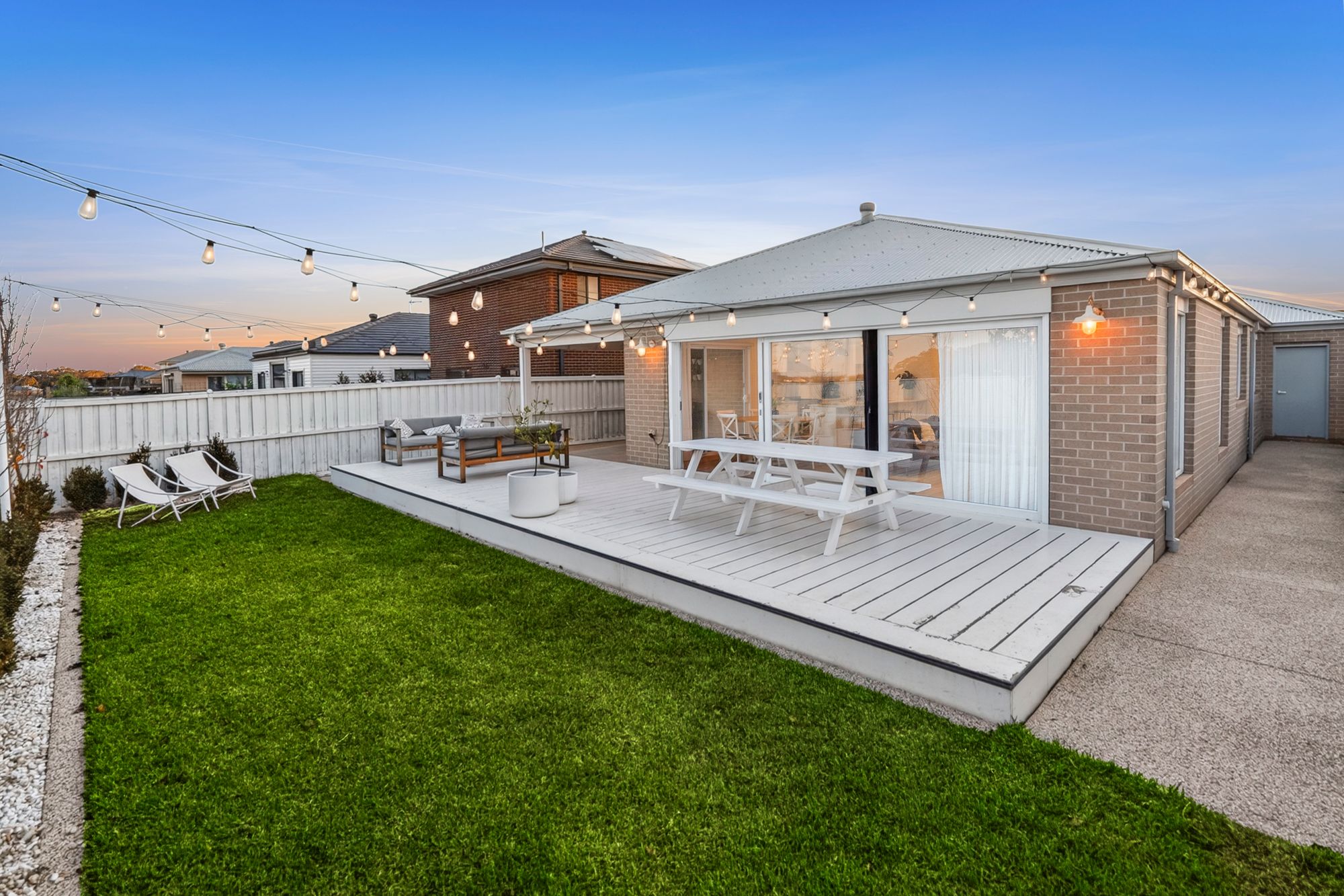 Outdoor: An upgraded façade welcomes you into the home with a light and bright colour pallete, feature lighting, colourbond roof, profiled garage door while the home is accented by luxe landscaping and a treelined street. The rear yard is a true highlight, showcasing a large deck ideal for entertaining, a tiled alfresco, exposed aggregate pathing surrounding the home, and a beautifully landscaped garden with mature trees and garden beds. A lush grassed area offers the perfect space for kids and pets to enjoy.